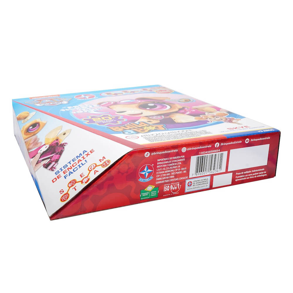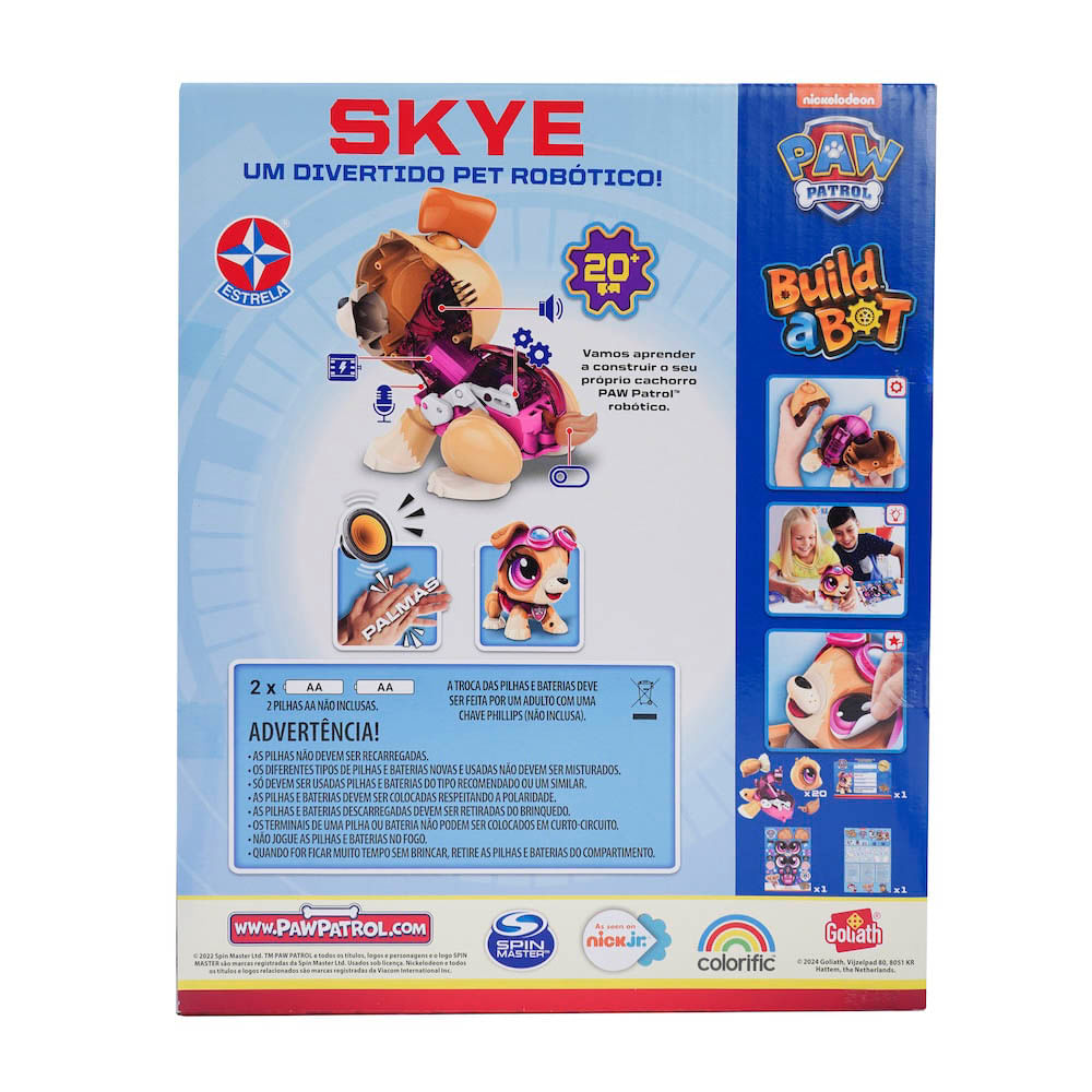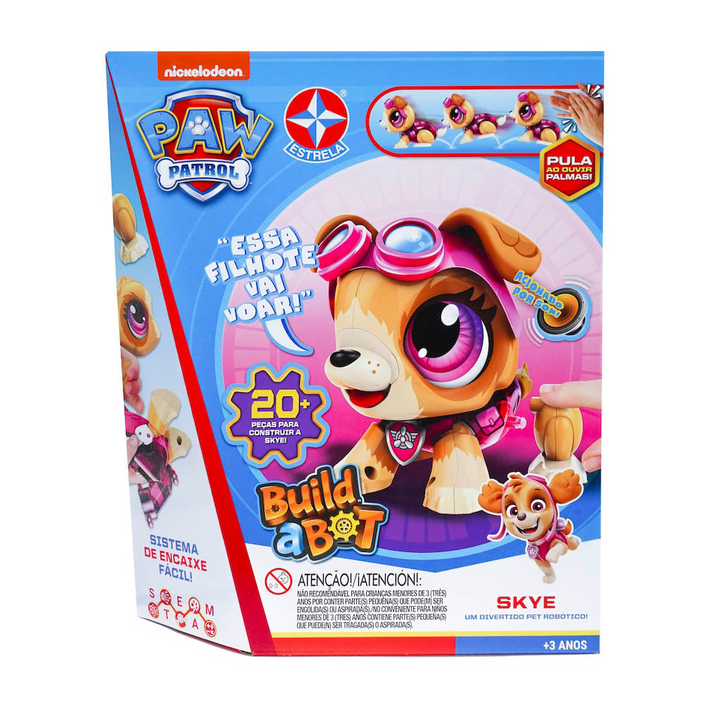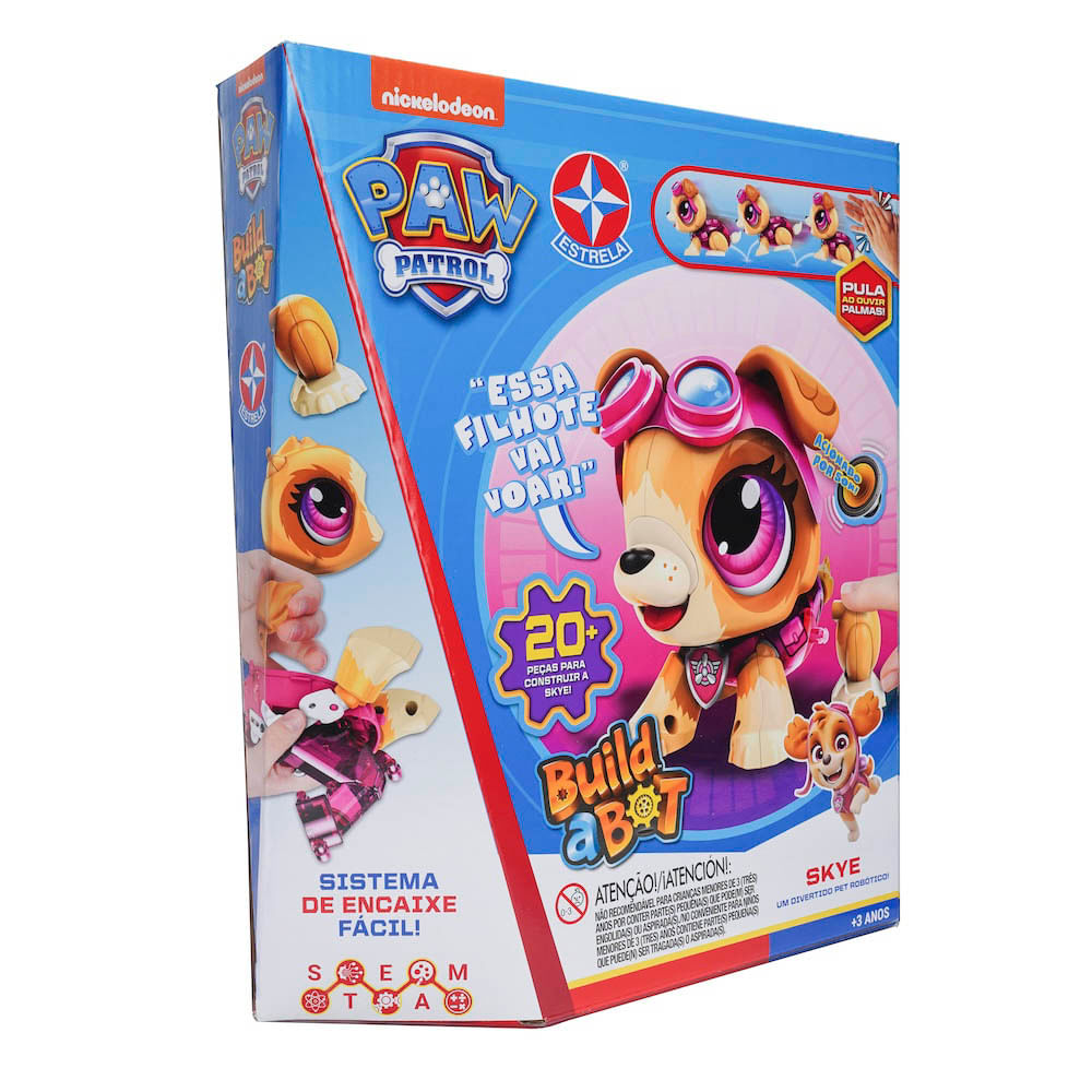 Com muita diversão trazemos a patrulha canina, brinque com a Skye uma das principais personagens do desenho Patrulha Canina. A cachorra vem desmontada em cerca de 20 peças plásticas e com eletrônica, sendo parte da importante da brincadeira montar a sua amiga robô. Quando montada, ela obedece movimentos acionados por palmas ou por toques no rabinho, falando frases icônicas de sua personagem e pulando! O brinquedo também é customizavel, vindo com uma cartela de adesivos para a criança decorar como quiser.
