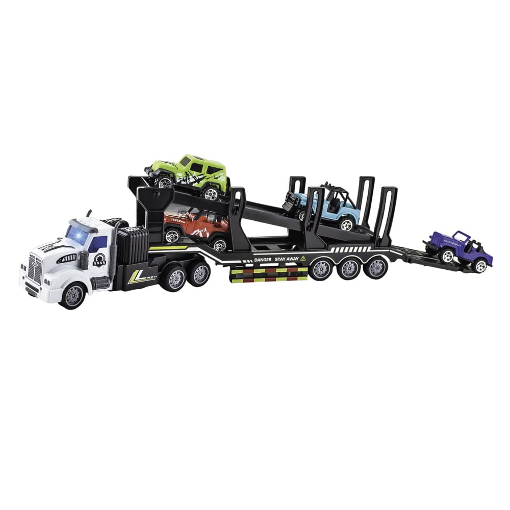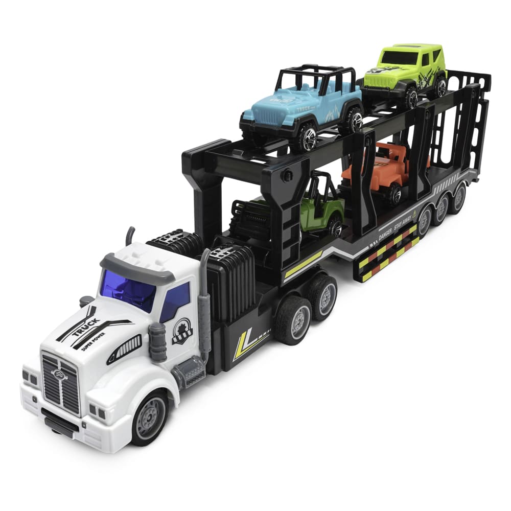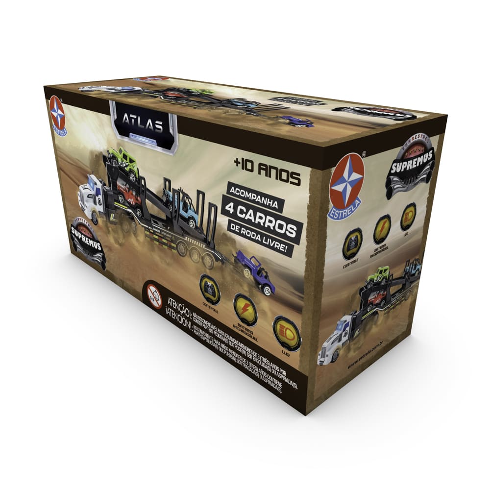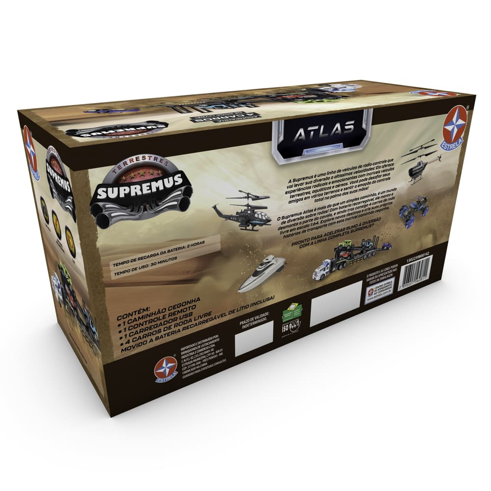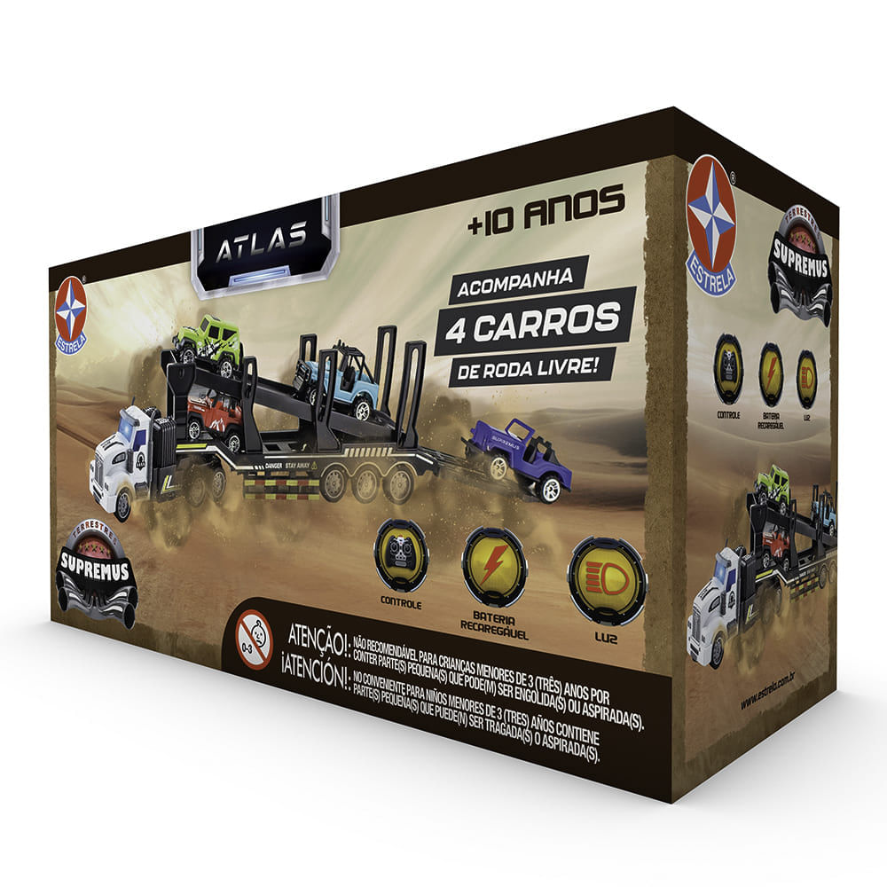O Supremus Atlas é um caminhão cegonha de controle remoto movido a bateria recarregável e com 7 funções. Sua carroceria é de plástico, e permite do cavalo se soltar da carreta, trazendo ainda mais diversão e variedade ao veículo. Além disso, inclui 4 carros de roda livre dando mais emoção e criatividade a brincadeira, possibilitando diversas aventuras terrestres. Sua bateria leva 2 horas de carregamento e tem tempo de uso de 1/2 hora, o controle requer 2 pilhas AA