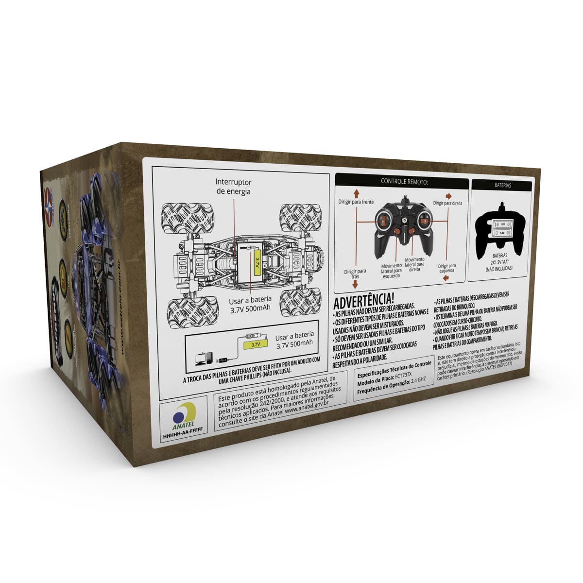 Ele possui uma carroceria forte de metal e luzes no farol frontal. Além disso, oferece 10 funções e tração nas 4 rodas, permitindo que o veículo se desloque para os lados e realize manobras 360, podendo fazer movimentos e desviar de obstáculos mais difíceis.