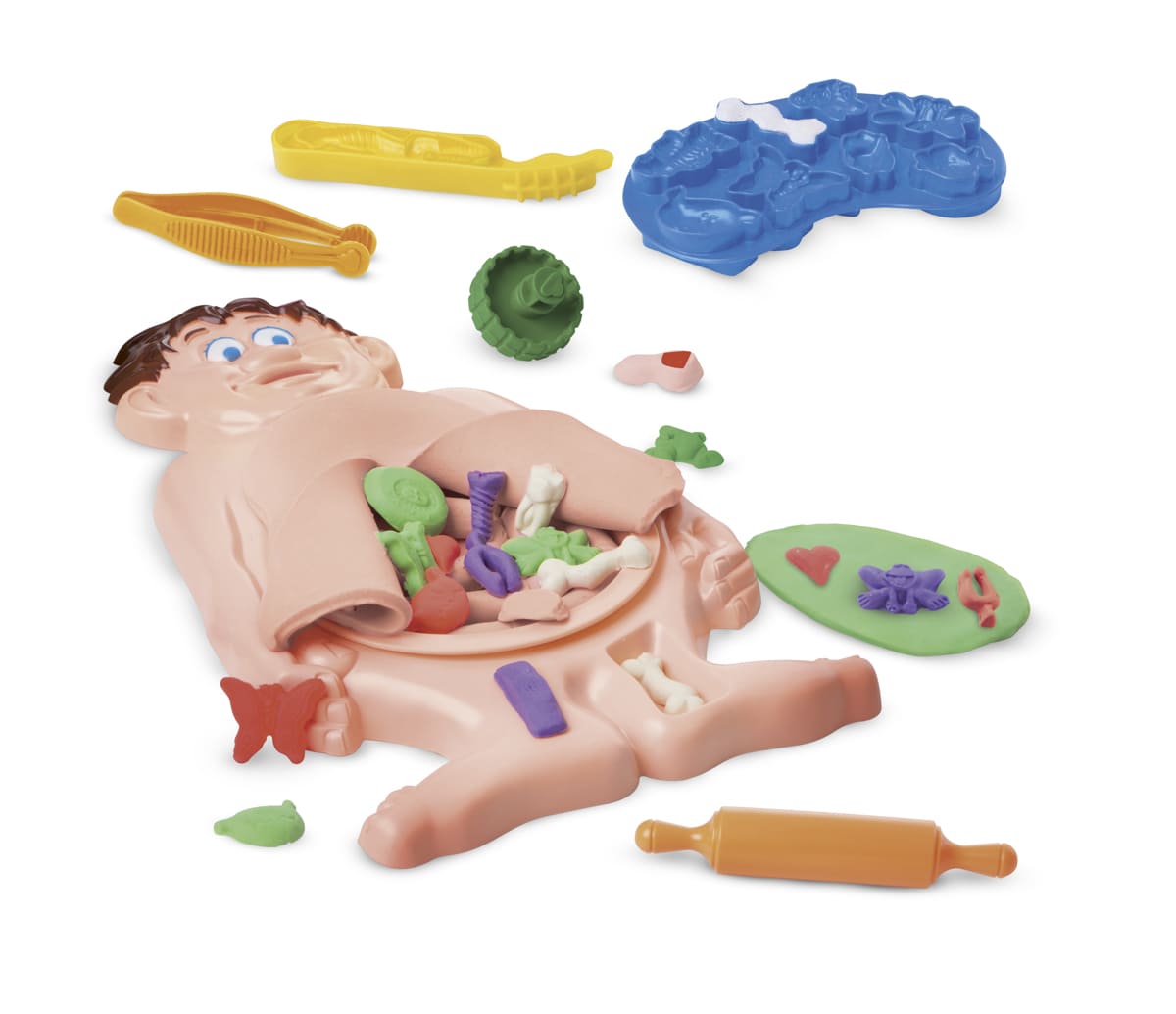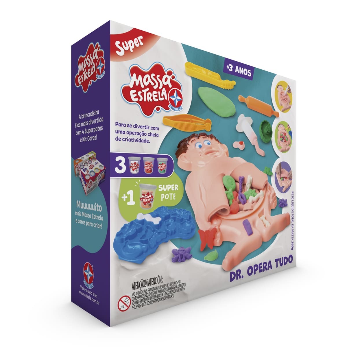 Com Dr. Opera Tudo de Massa Estrela, você pode abrir e cortar a barriga do paciente para inserir ossos, borboletas e tudo o que a imaginação puder criar! Depois é só costurar tudo e começar novamente. Vem com 3 potes de Super Massa de 50g e 1 pote de 140g.