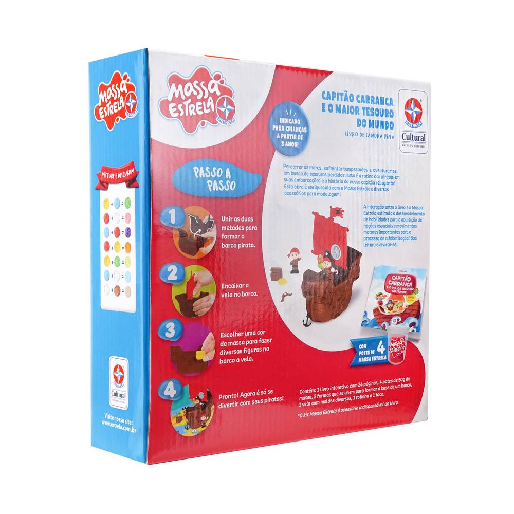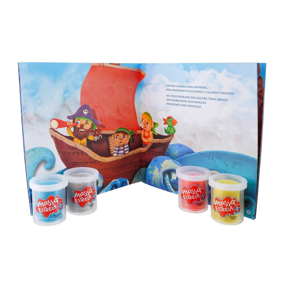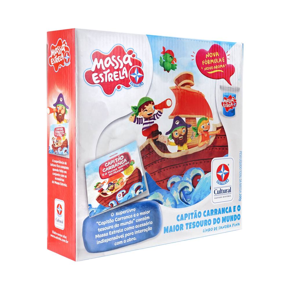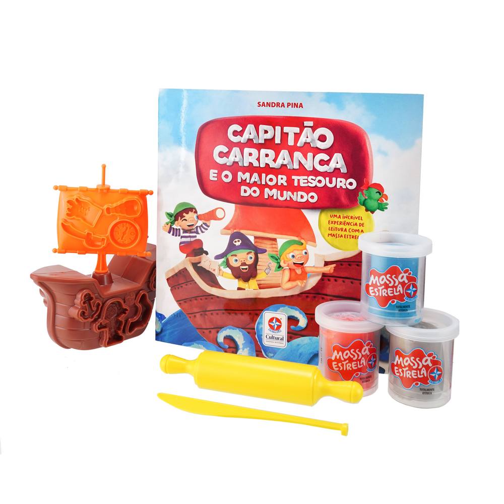 No livro Capitão Carranca e o maior tesouro do mundo, o solitário Pirata Carranca parte em busca do maior tesouro que encontrar! Quais surpresas o esperam? Que tesouro será esse? Nessa empolgante história de Sandra Pina, o leitor poderá ajuda-lo em sua busca, modelando o barco e todas as ferramentas necessárias para uma grande aventura! Acompanham o livro, 4 potes de 50g de Massa Estrela, 03 formas 2D, 01 rolinho e 01 faquinha plástica.