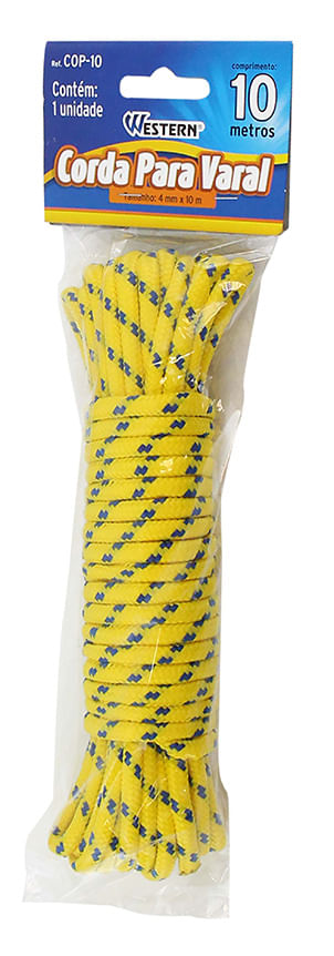 CORDA PARA VARAL REFORÇADA 10M - Dimensões da Peça: 0,4 x 0,4 x 100cm - Dimensões da Embalagem: 9 x 2,5 x 28cm - Quantidade Master: 100 Peças - Dimensões Master: 39,3 x 23,7 x 38cm - Material: 100% polipropileno - Cor: Amarelo, Verde, Roxo, Laranja e Azul - Tipo de Embalagem: Solapa com saco plástico - Marca: Western - Origem: China - Contém: 1 unidade - Tamanho: 4mm x 10m - Observação: - Este item é comercializado em cores sortidas: Amarelo, Verde, Roxo, Laranja e Azul - O Mix de cores é variável e na entrega você pode receber 1, 2, 3,4 ou 5 cores. - Cuidados: - Armazene em local seco e fresco, longe de fontes de calor. - Manter fora do alcance das crianças. - - - - - Garantia: - Em condições normais de uso, este produto tem garantia de 90 dias contra defeitos de material e fabricação, mediante apresentação da nota fiscal de compra. Má conservação, manuseio inadequa
