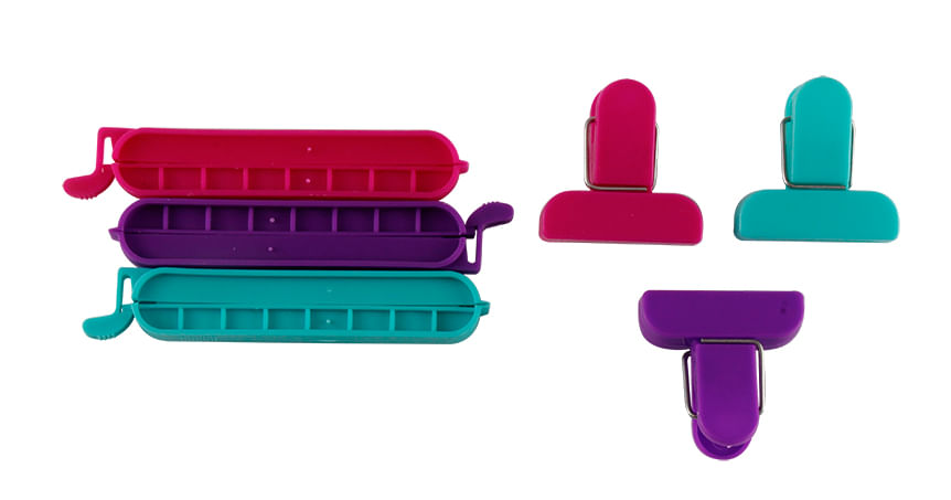 LACRE DE SACOLAS - Dimensões da Peça: - 3 Prendedores: 3,9 x 3,9 x 1,6cm - 3 Lacre: 9,9 x 1,7 x 1,6cm - Dimensões da Embalagem: 13,5 x 1,7 x 16,6cm - Quantidade Inner: 24 Peças - Dimensões Inner: 23 x 14,2 x 22,5cm - Quantidade Master: 96 Peças - Dimensões Master: 47,5 x 30,5 x 23,6cm - Material: PP - Cor: Roxo, Verde, Rosa - Tipo de Embalagem: Blister - Marca: Western - Origem: China - Ideal para vedar sacos plásticos e embalagens. - Use na Lava-louças. - Use no Freezer. - Kit com prendedores para pacote e lacres para embalagem maiores - Fácil de usar limpar - Fechamento por click - Não permite a circulação ar no pacote - Conserva seis alimentos por mais tempo