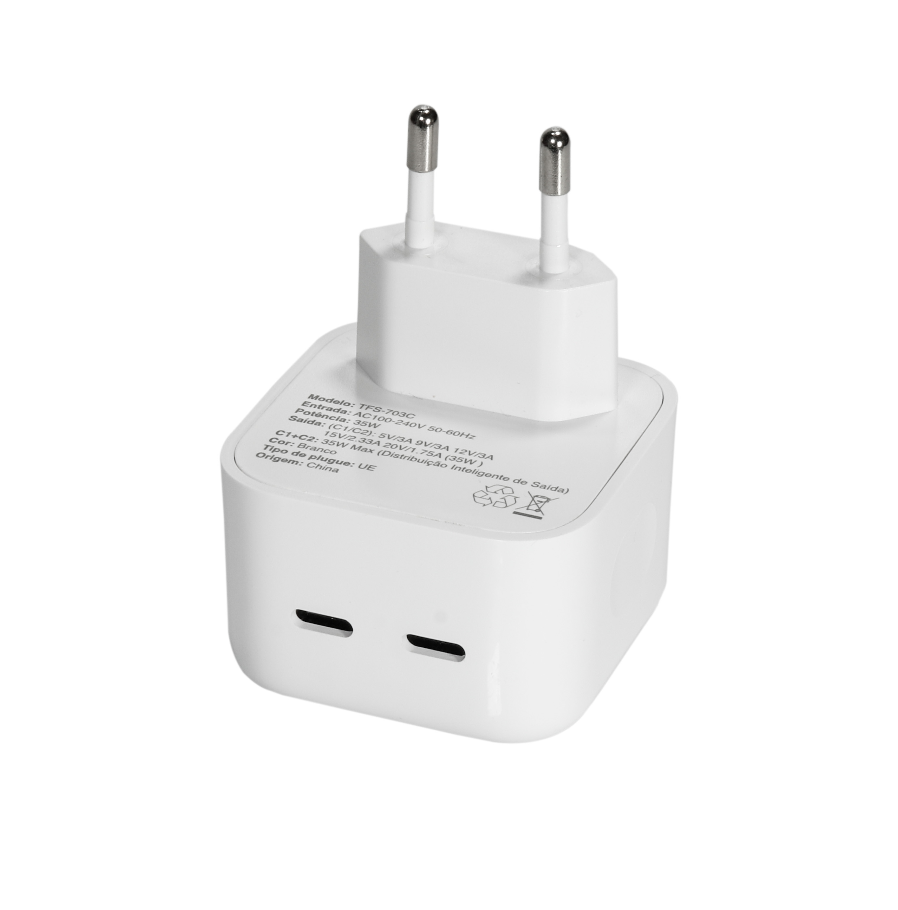 2 entradas TYPE C e Bivolt e Potência 35w e Voltagem de entrada: 100-240V e Voltagem de saída: 5V e 3A 9V e 2A 12V e 1.5A e Tomada de 2 pinos e ideal para recarregar de forma rápida os mais diversos dispositivos móveis Suporta até 2 recargas simultâneas e Composição: plástico e elementos elétricos.