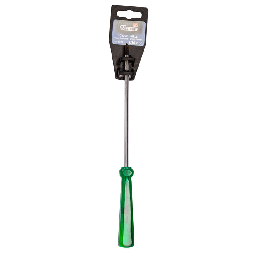 "CHAVE PHILIPS 3/16X6"" - Dimensões da Peça: 25 x 1,9 x 1,9cm - Dimensões da Embalagem: 4,5 x 2 x 26cm - Quantidade Inner: 24 Peças - Dimensões Inner: 27,5 x 20,5 x 8cm - Quantidade Master: 240 Peças - Dimensões Master: 41 x 31 x 44,5cm - Material: Aço cromo vanádio e PVC (Policloreto de vinil) - Cor: Cabo verde - Tipo de Embalagem: Suporte - Marca: Western - Origem: China - Contém: 1 unidade - Profissional (PRO). • Chave com lâmina redonda para parafusos tipo fenda cruzada e philips. • Indicado para aperto e desaperto de parafusos com fenda cruzada. • Ponta imantada. • Cromo vanádio. - Cuidados: • Utilize equipamentos de proteção individual. não utilize em aparelhos energizados. ferramenta não isolada. • MANTER FORA DO ALCANCE DAS CRIANÇAS. - Sac Fornecedor: • Sac: 0800 607 1322 • Email: posvenda@etilux.com.br • Site: www.etilux.com.br - Garantia: • Em condições normais de uso, este produto tem garantia de 90 dias contra defeitos de material e fabricação, mediante apresentação da nota fiscal de compra. Má conservação, manuseio inadequado, quedas ou quaisquer outras avarias produzidas pelo uso incorreto, a garantia oferecida perde a validade."