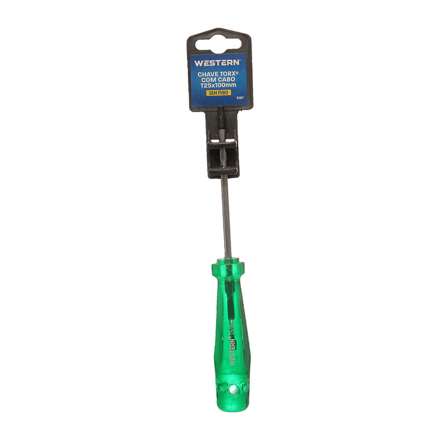 CHAVE TORX COM CABO VERDE T25 - Dimensões da Peça: 20,5 x 2,5 x 2,5cm - Dimensões da Embalagem: 4,5 x 2,5 x 25cm - Quantidade Inner: 12 Peças - Dimensões Inner: 27,5 x 8,5 x 7,5cm - Quantidade Master: 120 Peças - Dimensões Master: 29,5 x 18 x 42cm - Material: Aço cromo vanádio e PVC - Cor: Cabo verde - Tipo de Embalagem: Suporte - Marca: Western - Origem: China - Contém: 1 unidade - Característica: • Sem furo. • Tamanho: T25 x 100mm. - Perigos: - Cuidado durante o manuseio do produto para evitar acidentes. - Cuidados: • Utilize equipamento de proteção individual. Necessário ao trabalho (óculos de proteção, botas, etc..). - Advertência/Atenção: • Manter fora do alcance das crianças. - Sac Fornecedor: • Sac: 0800 607 1322 • E-mail: posvendas@etilux.com.br • Site: www.etilux.com.br - Garantia: • Em condições normais de uso, este produto tem garantia de 90 dias contra defeitos de material e fabricação, mediante apresentação da nota fiscal de compra. Má conservação, manuseio inadequado, quedas ou quaisquer outras avarias produzidas pelo uso incorreto, a garantia oferecida perde a validade.