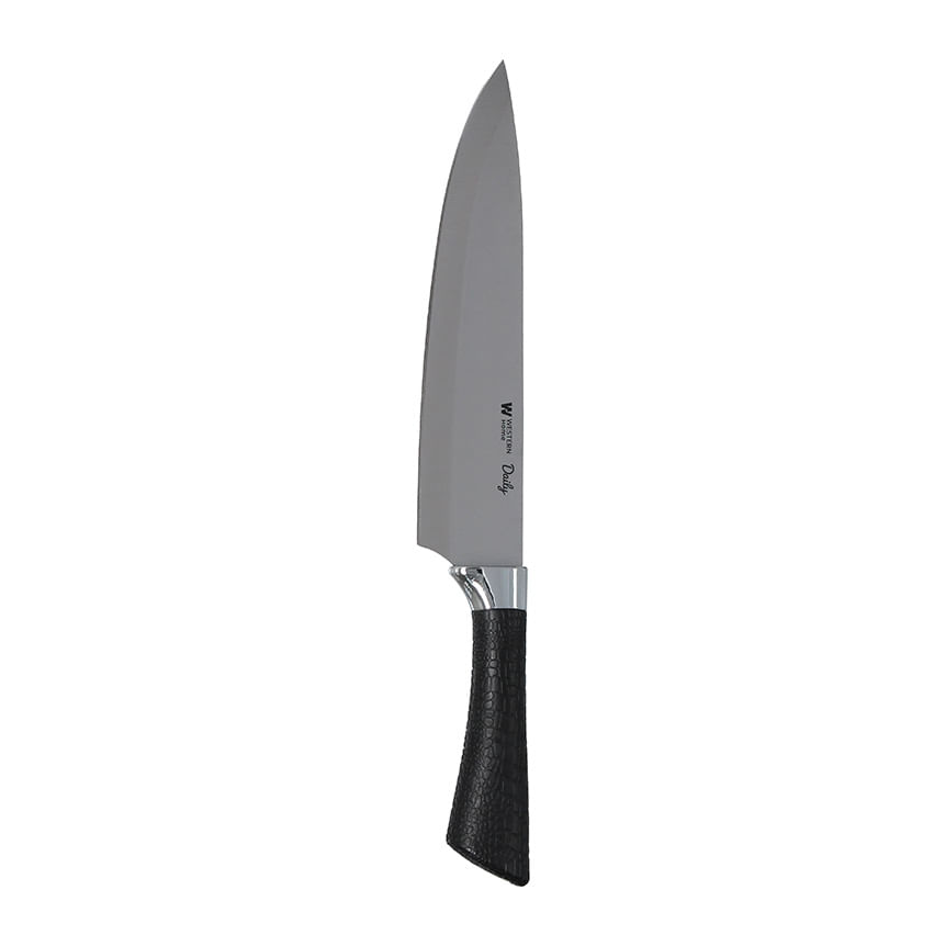 "FACA CHEF DE INOX COM CABO DE PLÁSTICO PRETO DAILY 8"""" - Contém: - Dimensões da peça: 4,5 x 2 x 32,5cm (CxLxA) - Dimensões da Embalagem: 6,5 x 2,8 x 39,5cm (CxLxA) - Quantidade Inner: 24 Peças - Dimensões Inner: 38,5 x 15 x 13cm (CxLxA) - Quantidade Master: 96 Peças - Dimensões Master: 41 x 33 x 25cm (CxLxA) - Material: Aço Inoxidável e Plástico (Polipropileno e ABS) - Cor: Preto e Prata - Tipo de Embalagem: Blister - Marca: Western Home - Origem: China - Características: Lâmina 8” (204mm) | Espessura 1,5mm - Perigos: • Cuidado ao manusear, contém item(s) cortantes e perfurantes. • Cuidado durante o manuseio do produto para evitar acidentes. - Cuidados: • Lave o produto somente com sabão neutro e esponja macia. • Mantenha o produto sempre limpo para o próximo uso. • Para secar, utilize um pano seco e macio. - Advertência/Atenção: • Manter fora do alcance das crianças. - Antes do uso: • Verificar se o produto está em perfeitas condições de uso ou instalação. • Lave a peça com detergente neutro e esponja macia. - Sac Fornecedor: • Sac: 0800 607 1322 • Email: posvendas@etilux.com.br • Site: www.etilux.com.br - Garantia: • Em condições normais de uso, este produto tem garantia de 90 dias contra defeitos de material e fabricação, mediante apresentação da nota fiscal de compra. Má conservação, manuseio inadequado, quedas ou quaisquer outras avarias produzidas pelo uso incorreto, a garantia oferecida perde a validade."