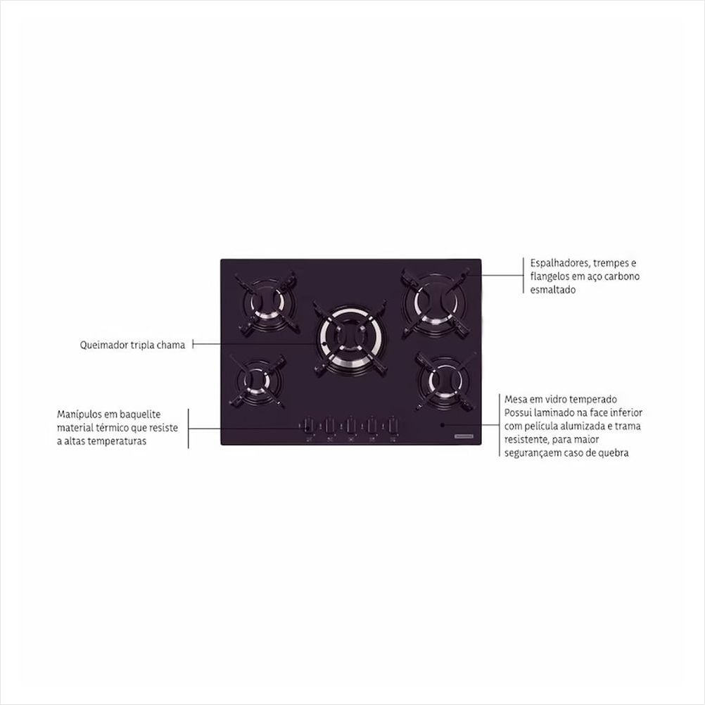 5 queimadores, incluindo um com chama tripla para maior eficiência