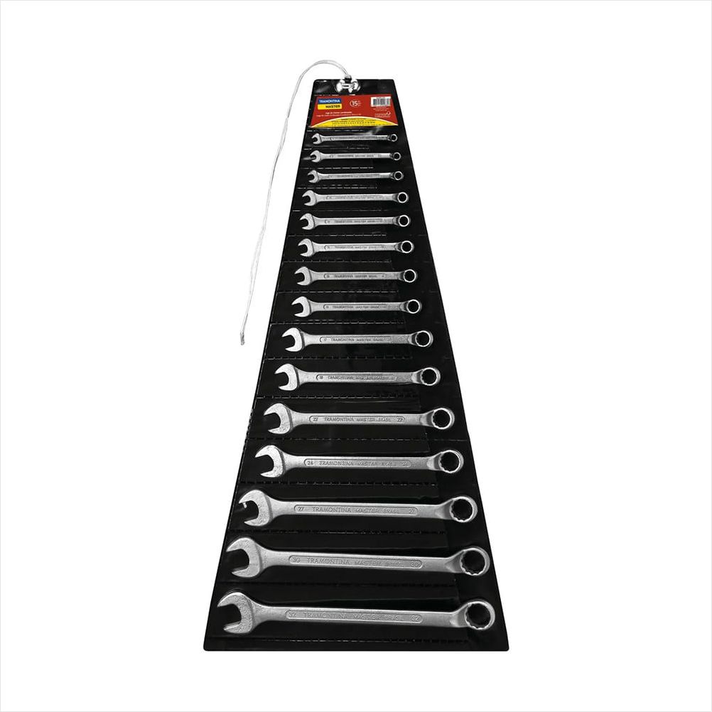 O Jogo de Chaves Combinadas Tramontina MASTER apresenta um corpo forjado em aço vanádio cromado, garantindo durabilidade e resistência para as mais diversas tarefas. Composto por 15 peças em milímetros, oferece tamanhos variados para um encaixe preciso em porcas e parafusos, tornando suas atividades mais práticas e eficazes. O acabamento cromado confere um visual elegante e facilita a limpeza das chaves.