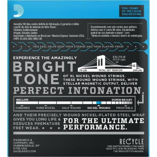 O Encordoamento Para Guitarra D Addario EXL110-B proporciona uma combinação ideal de timbre, flexibilidade e durabilidade. Um padrão para maioria das guitarras. As D Addario XL Nickel Wound são reconhecidas mundialmente como a escolha dos grandes músicos, entre guitarristas de todos os gêneros e estilos. São feitas de aço banhado a níquel e enroladas com alta precisão ao redor de uma alma hexagonal, resultando em uma corda com inconfundível timbre brilhante e excelente afinação.