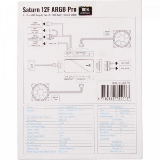 • 3 ventiladores Saturn 12F ARGB, 1 hub de controle RGB H66F e 1 controle remoto.