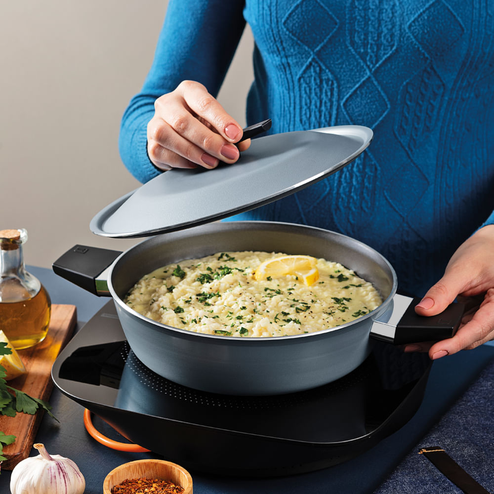 Com seu revestimento interno e externo em antiaderente Starflon Excellent, a arrozeira oferece máxima durabilidade e facilita a limpeza, evitando que os alimentos grudem. Sua compatibilidade com fogões de indução a torna versátil para diferentes tipos de cozinhas, combinando funcionalidade com um design elegante na cor Azul Ardósia.