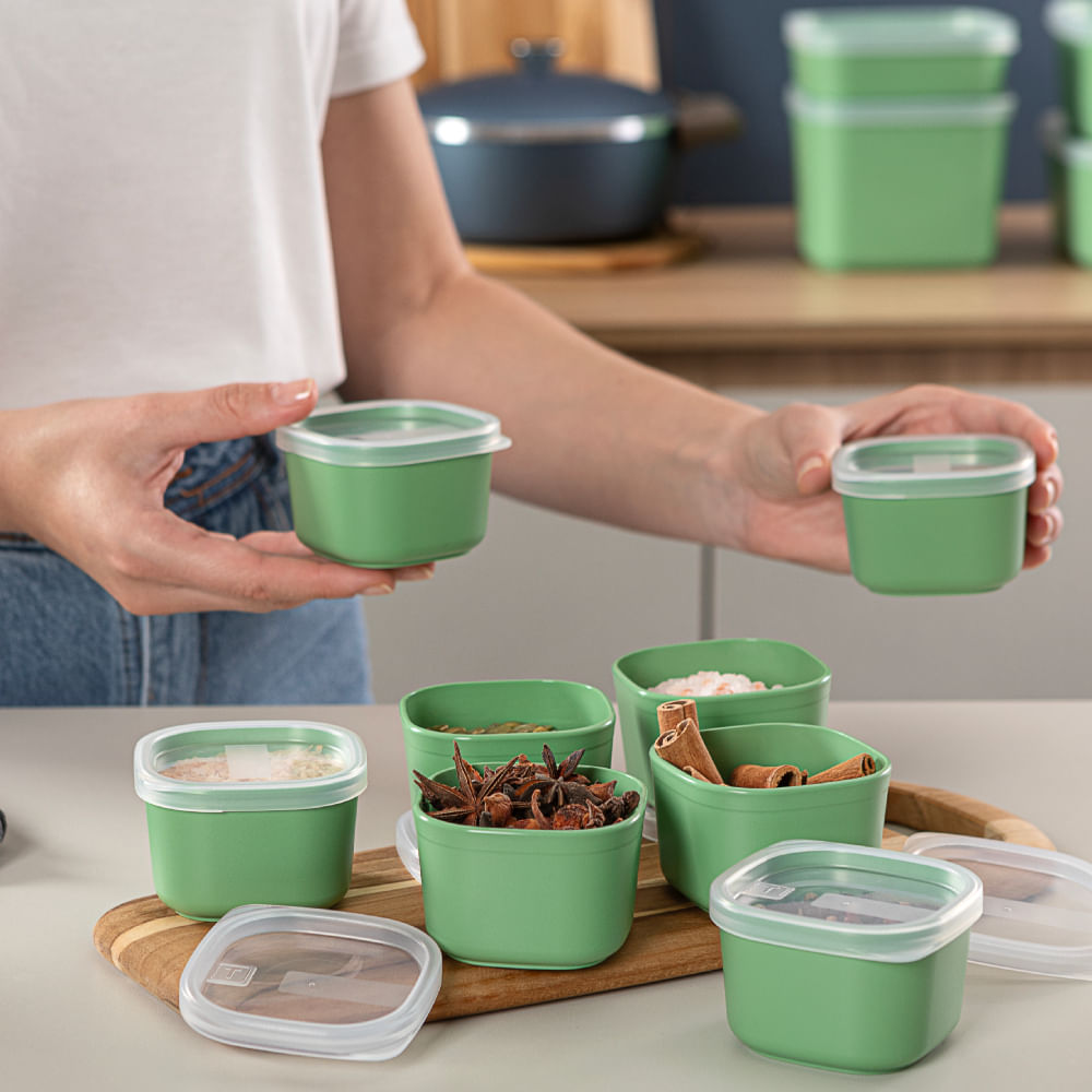 Fabricado em polipropileno de alta qualidade pela Tramontina, sua capacidade de 150 ml é versátil para temperos, lanches ou itens. A cor verde sálvia e a tampa transparente facilitam a identificação, otimizando seu tempo e espaço.