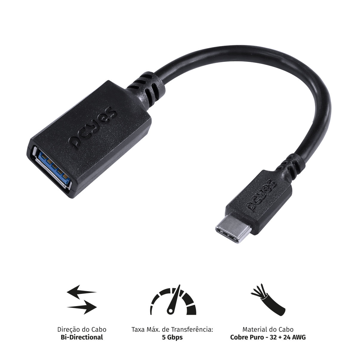 Cabo Adaptador OTG Tipo C USB 3.0 15cm Preto PCYES