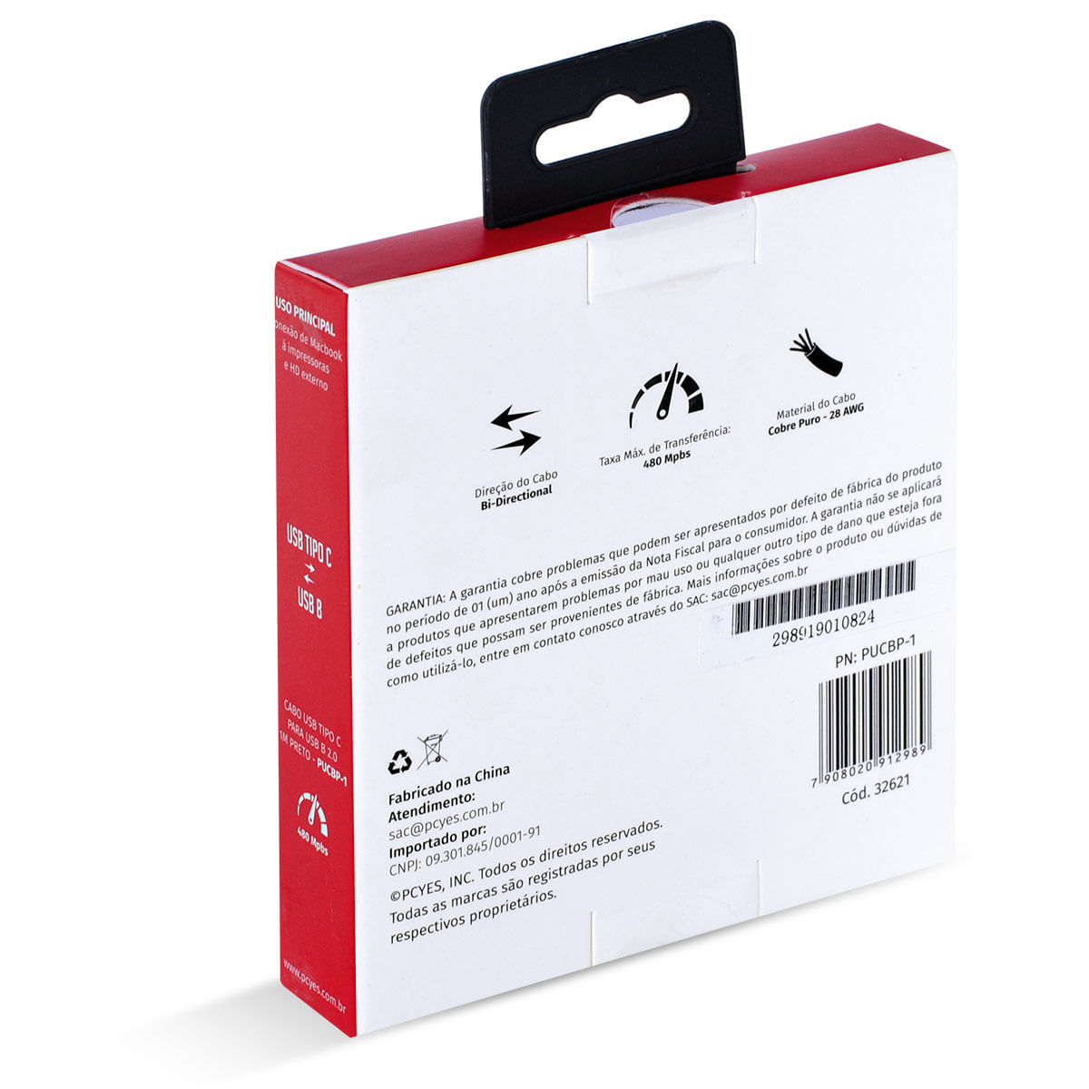 Cabo para Impressora USB Tipo C para USB B 2.0 1 Metro Preto PCYES - PUCBP-1