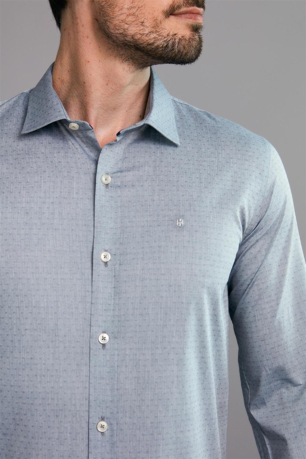 O produto apresenta o colarinho Milano, com pé de gola medindo 3,5 cm, pontas de 6,5 cm e uma abertura de 10,5 cm, com pesponto de 0,3 cm, além de mangas longas com abotoamento nos punhos. O produto é confeccionado com modelagem Slim Fit, conta com a forma mais ajustada ao corpo, resultando em uma peça sem sobra de tecidos, ideal para quem busca um visual mais alinhado.
