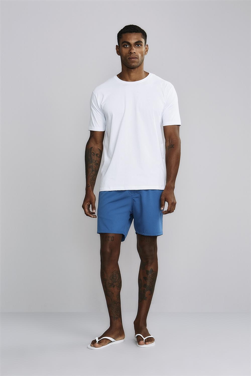 A camiseta masculina é confeccionada em malha de algodão, possui modelagem slim fit, mangas curtas, gola redonda e caimento leve. Apresenta forma ajustada ao corpo, proporcionando uma silhueta marcada ao homem que veste.