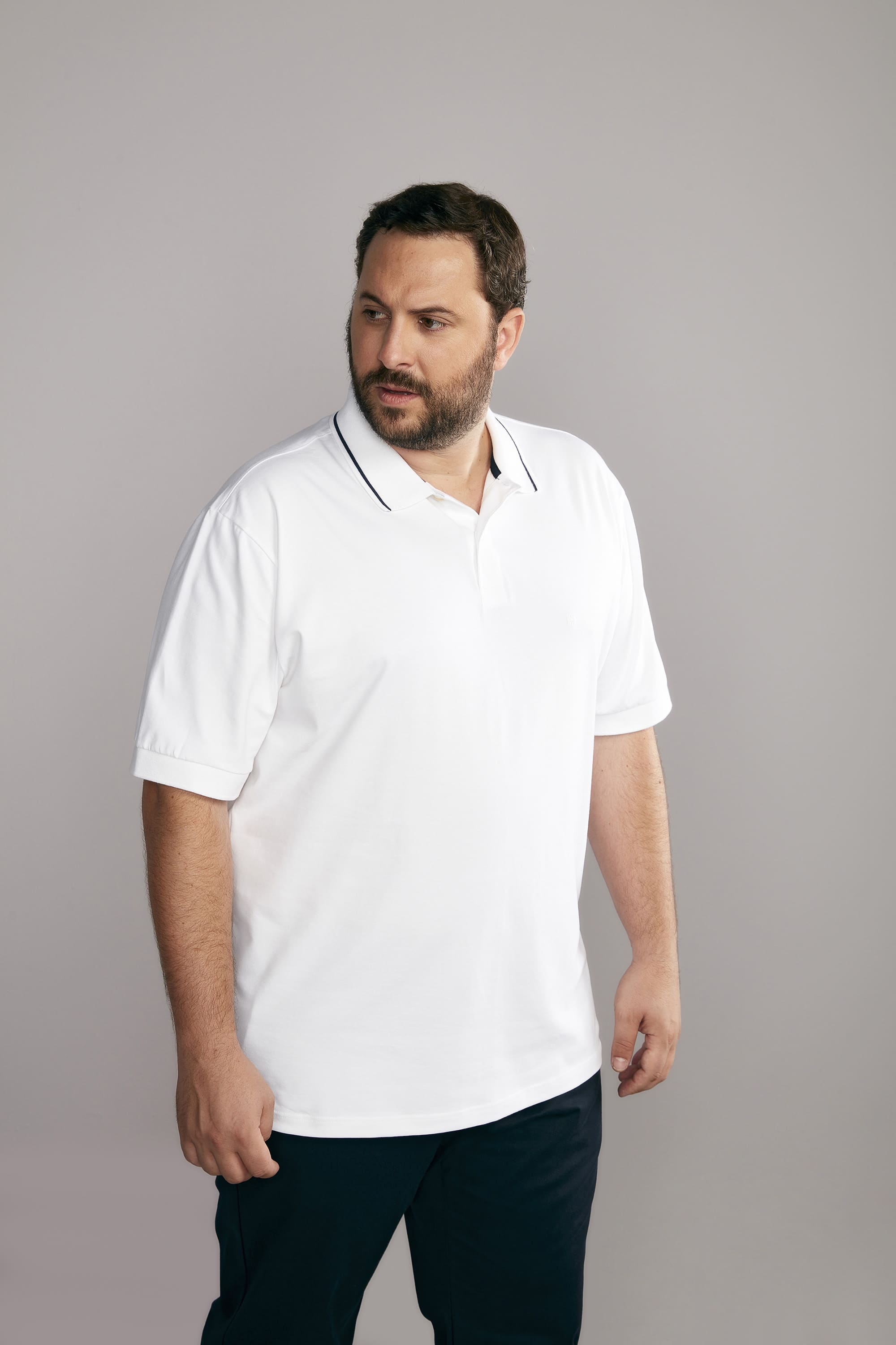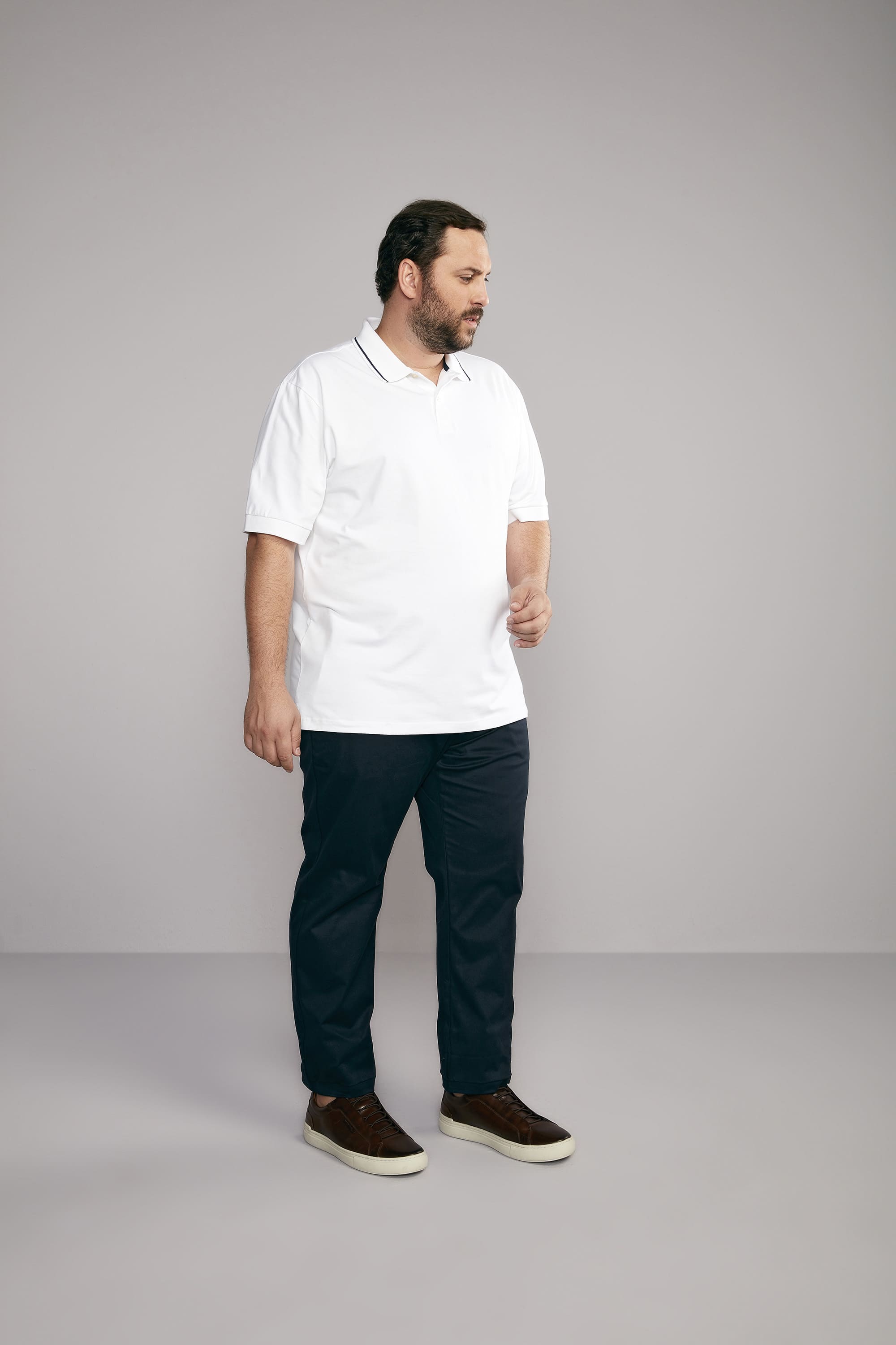 Para uma composição casual e confortável, a polo confeccionada em malha de algodão e elastano é um ótimo investimento por sua qualidade, durabilidade e seu toque macio.