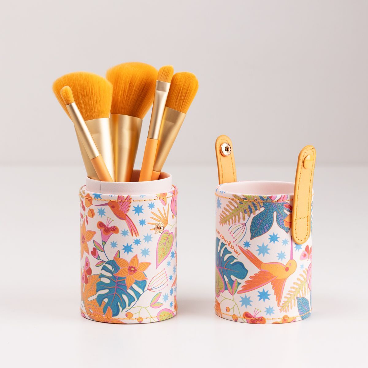 Contando com uma exclusiva estampa tropical colorida e alegre, ele traz um case com um design moderno e 5 graciosos pinceis de maquiagem tão lindos quanto o verão!