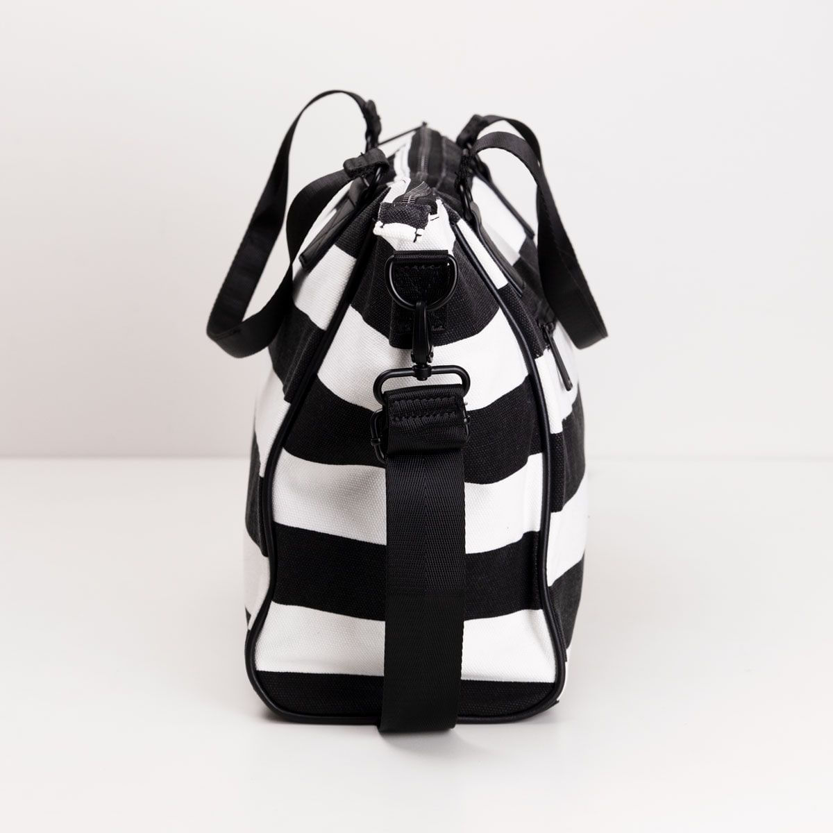 No tecido canvas e toda listrada em preto e branco, ela traz: