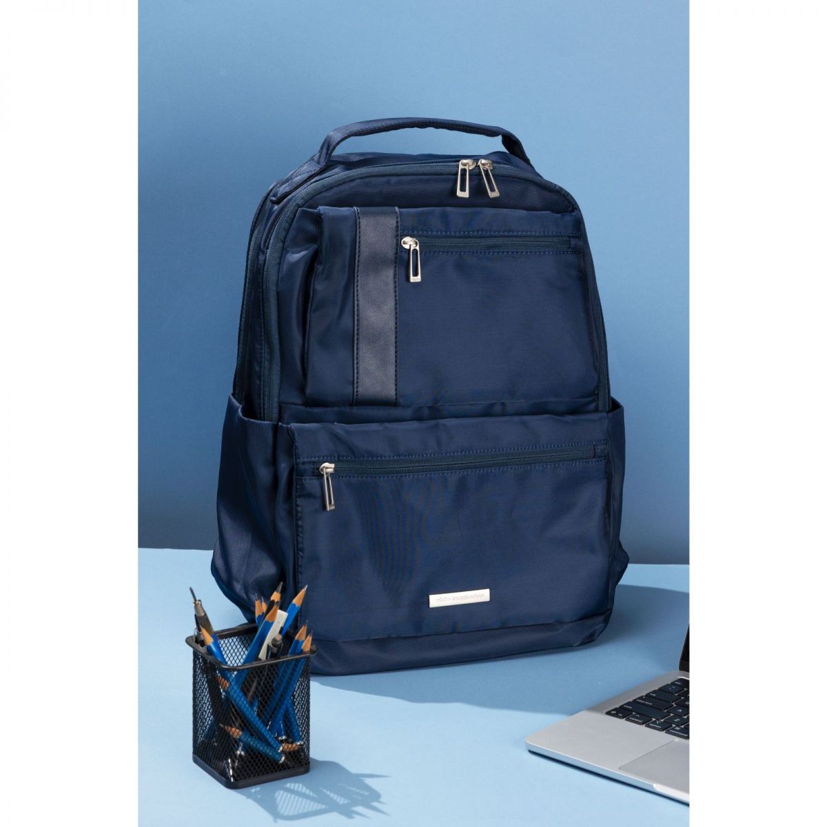 Se você é fã de cores neutras e praticidade, então vai amar a nossa Mochila Laptop Bolsos Azul Marinho!