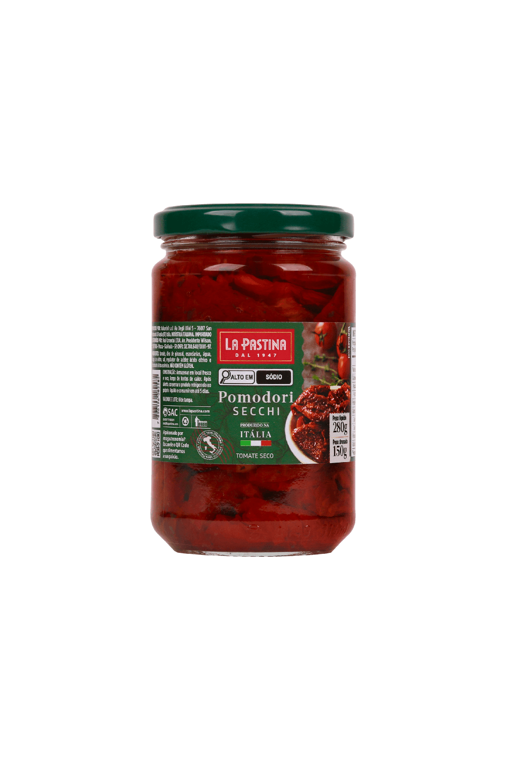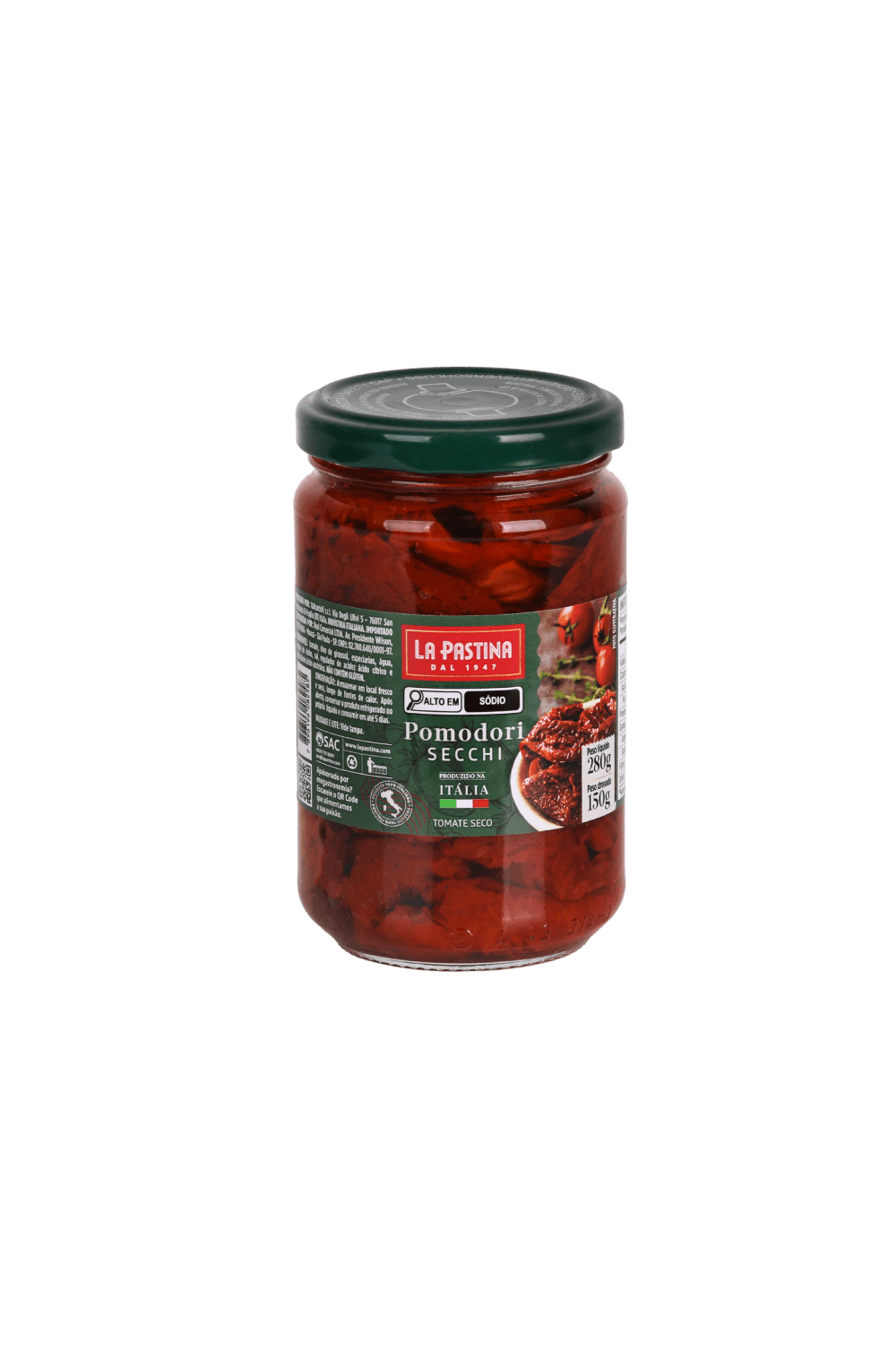 Um dos best sellers da La Pastina, o tomate seco é rico em umami, considerado o 5º gosto, relacionado com o realce do sabor. A produção envolve a desidratação do tomate e são acrescentados sal e açúcar, para equilibrar a acidez. Conservado em óleo de girassol, vinagre de vinho e especiarias, apresenta textura macia e sabor adocicado, ideal para recheios de pizzas, sanduíches, e muito mais.