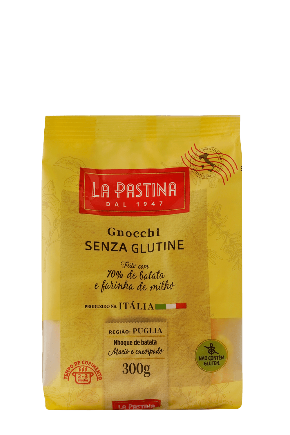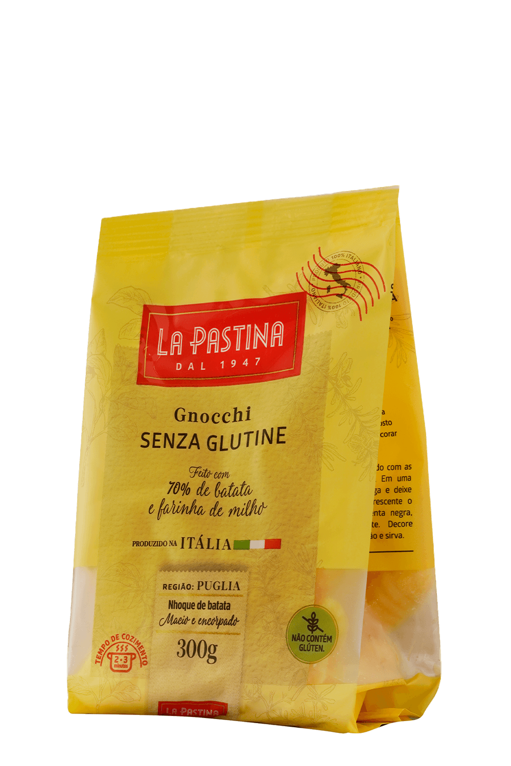 Elaborado com 70% de batata e farinha de milho, é a opção ideal para celíacos ou adeptos de uma alimentação sem glúten, mas que não abrem mão de saborear uma autêntica massa italiana. Quanto mais batata e menos farinha na sua composição, melhor a qualidade do gnocchi. Um grande diferencial do nosso gnocchi é que ele não precisa de refrigeração antes de aberto, devido a sua embalagem em ATM (atmosfera modificada), que mantém a massa como fresca. Indicações de uso: Ideal para consumir com azeite, manteiga ou molhos diversos
