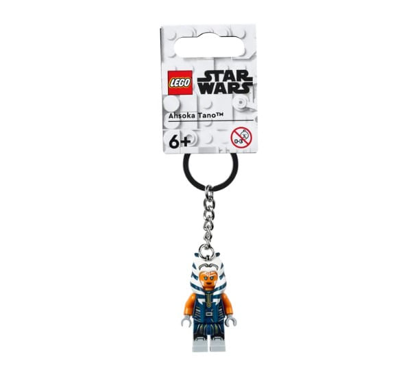 • Porta-chaves Ahsoka Tano (854186) – Minifigura LEGO® de Ahsoka Tano com uma corrente e anel de metal robusto. Nota: a minifigura está fixa à corrente de metal e não pode ser removida.