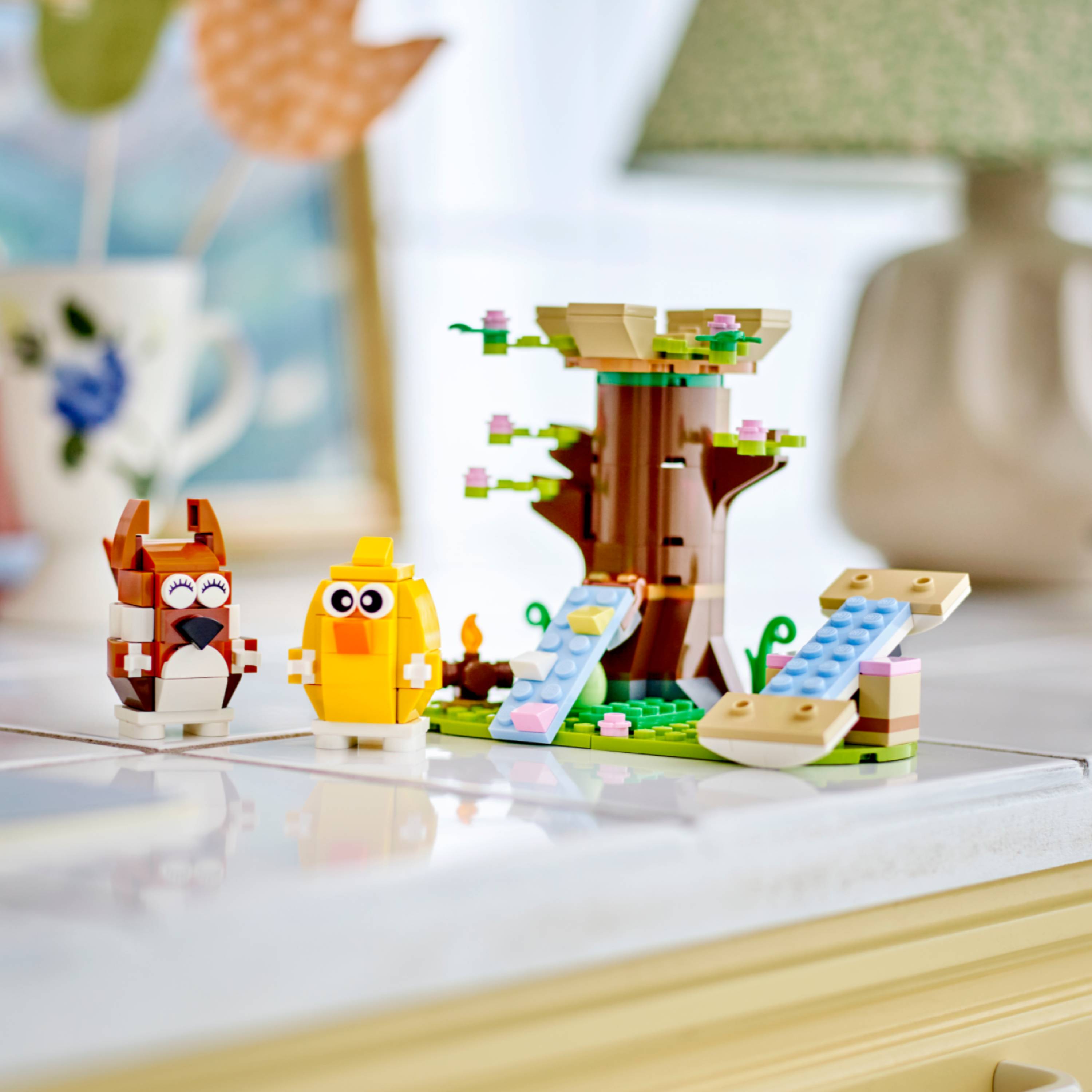 Comemore a Páscoa com este fantástico animal de brinquedo LEGO® repleto de recursos incríveis. O conjunto Spring Animal Playground (40709) permite que meninos e meninas com mais de 8 anos encenem histórias divertidas com um esquilo, um pássaro, uma casa na árvore, uma fogueira, uma gangorra e 2 ovos de Páscoa.