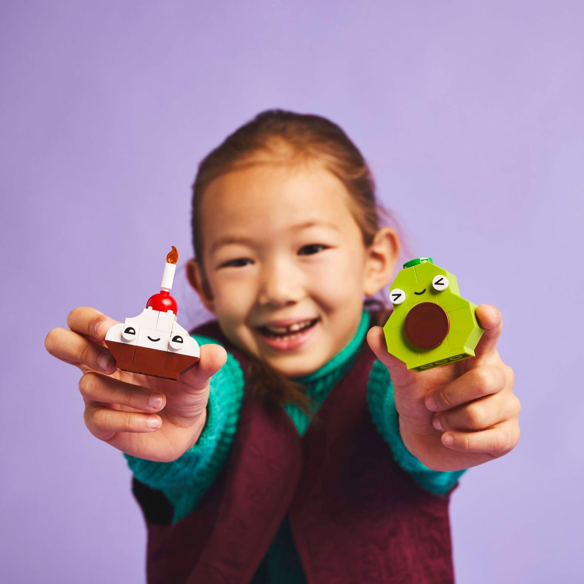As crianças usam a variedade colorida e cativante de tijolos de construção e peças especiais – como olhos, bocas e vários elementos decorativos – para construir 4 brinquedos fofos Food Friend: um cupcake, sorvete, abacate e taco. A diversão criativa continua enquanto as crianças misturam os tijolos para reconstruir os modelos em um bolo com granulados, bebida de chá de bolhas, pêra e um panini. À medida que as crianças se tornam mais confiantes em suas habilidades de construção, elas podem seguir o guia de construção intuitivo para mudar expressões, formas ou cores para criar novos Food Friends, incluindo um sorvete verde, caixa de suco, fatia de melancia, barra de chocolate e um mega sanduíche.