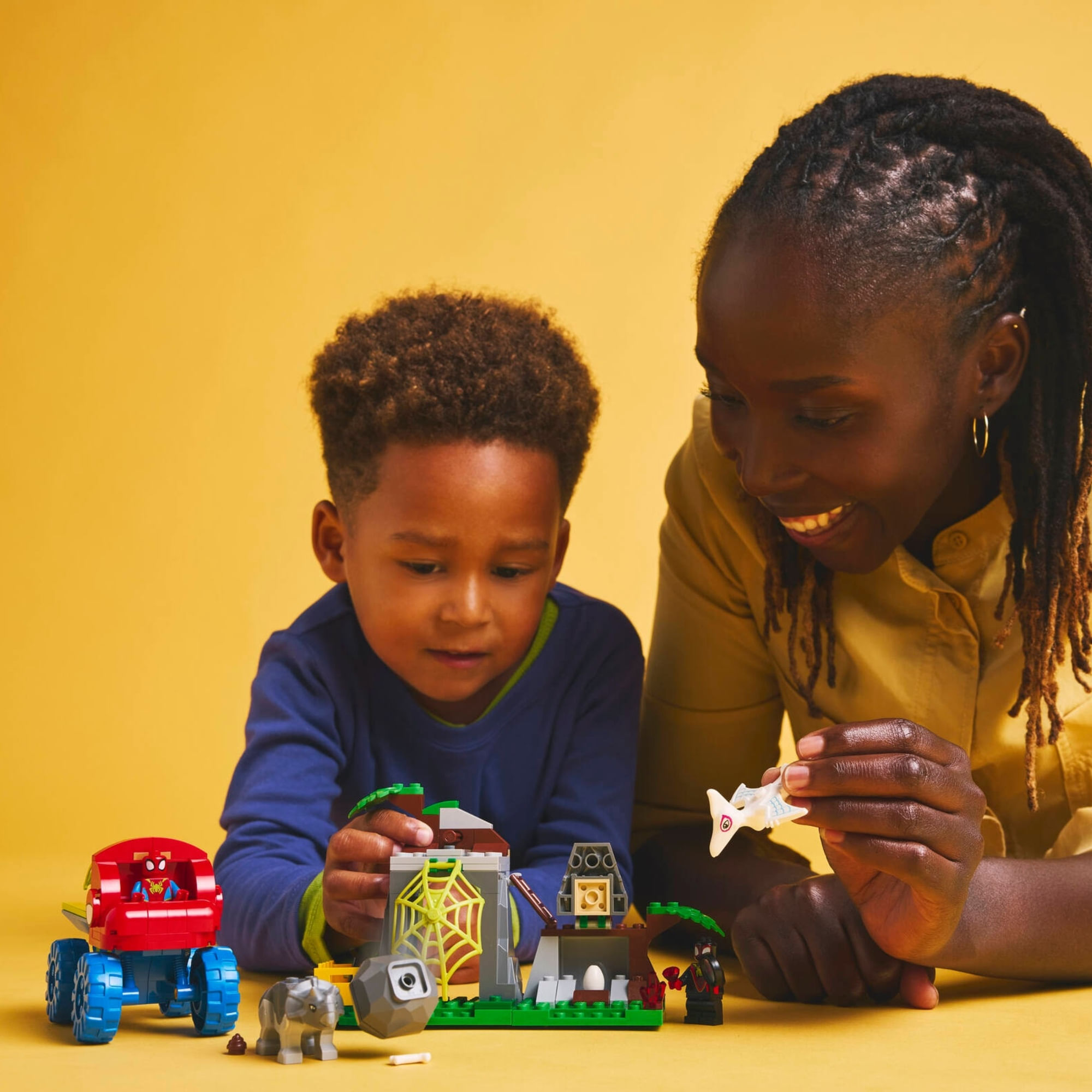 Brinquedos de aventura para construir e brincar – Crianças criativas podem aproveitar uma experiência interativa com um ovo de dinossauro escondido, teias LEGO® Spidey para capturar vilões e uma queda de rochas acionada por gatilho