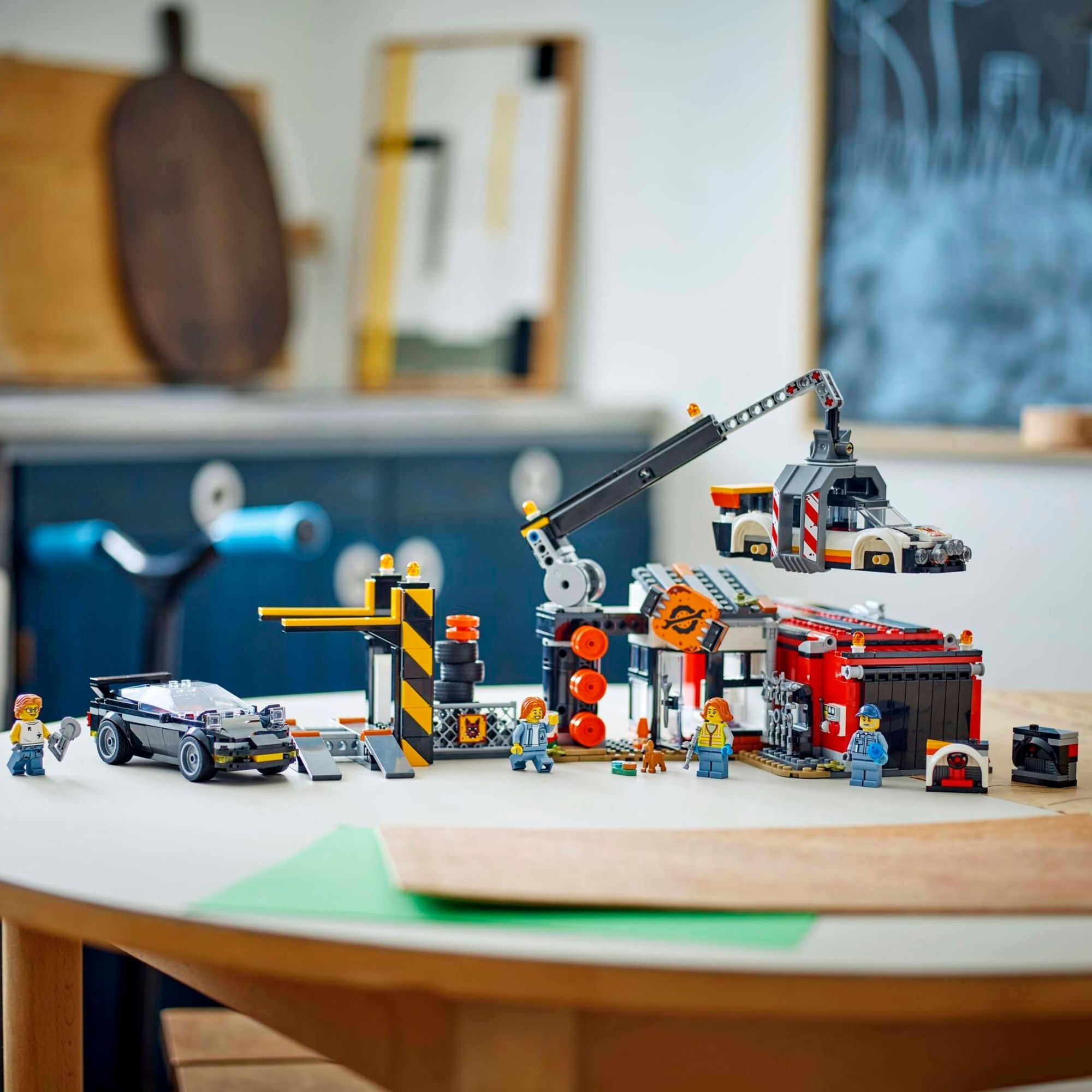 O que há na caixa? – Este brinquedo LEGO® ferro-velho inclui tudo o que as crianças precisam para construir um ferro-velho de brinquedo com um guindaste de garra, triturador, prédio de escritórios, 2 carros e 4 minifiguras de trabalhadores