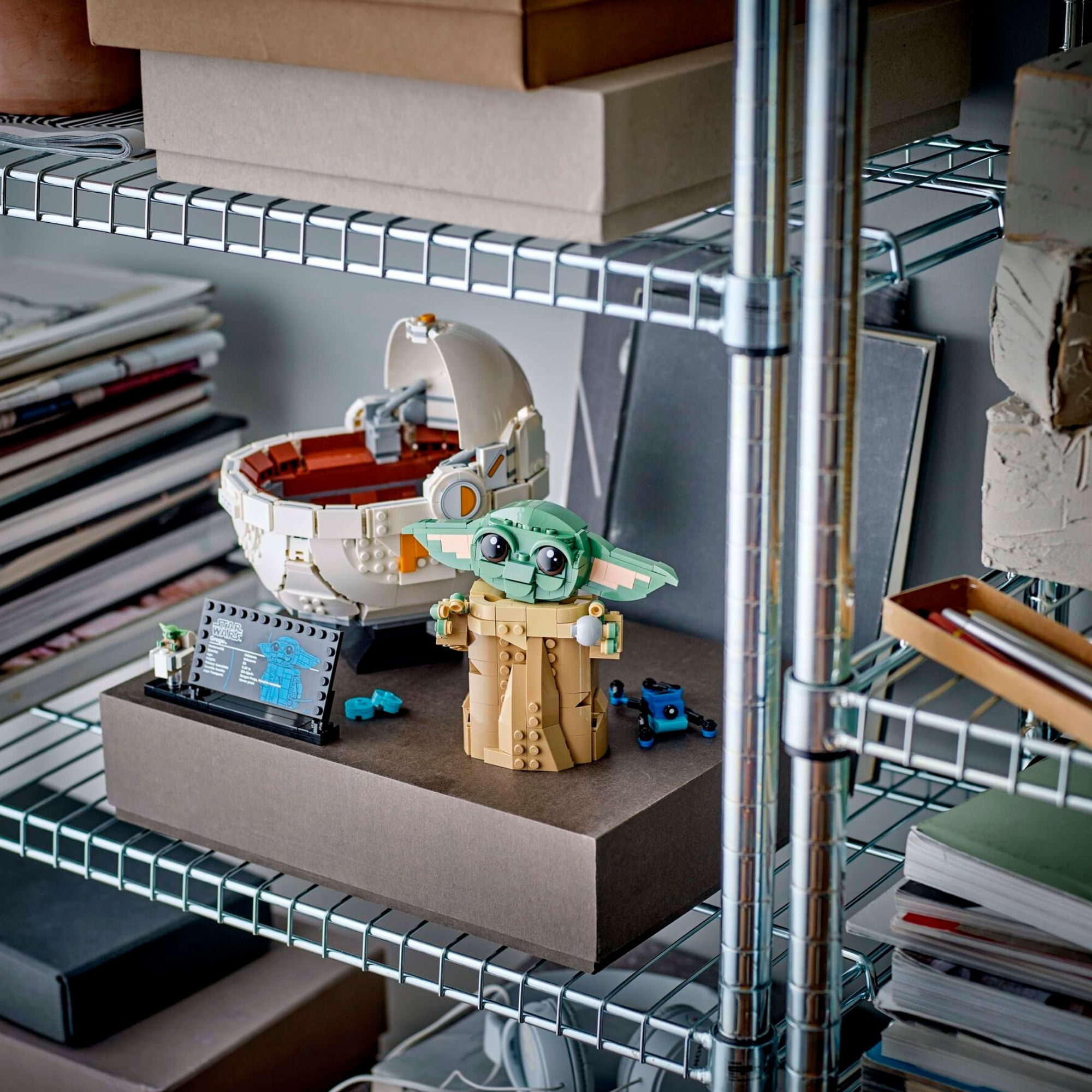 Figura Grogu LEGO® – O modelo principal de brinquedo montável vem com uma placa de informações Grogu em um suporte com espaço para a figura Grogu LEGO de tamanho padrão incluída em um pequeno carrinho flutuante montável