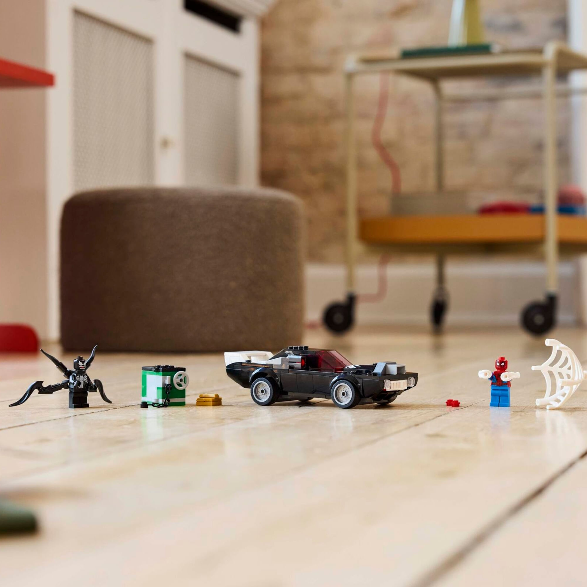 O brinquedo de carro Venom montável vem com 3 minifiguras: Homem-Aranha com um lançador de teias, Venom com 4 tentáculos e Mulher-Aranha (Julia Carpenter) com uma teia flexível que é grande o suficiente para capturar um vilão. O carro Venomizado possui um atirador de cada lado, um motor acessível e um cockpit que abre. Venom pode sentar-se dentro do carro removendo seus 2 tentáculos inferiores, que podem ser usados ??para Venomizar ainda mais o carro. Um cofre contendo barras de ouro inspira uma ação de dramatização entre os heróis e o vilão. O cofre pode ser arrastado pelo carro, que também inclui um compartimento para as barras de ouro. Para maior diversão digital, os construtores podem aumentar o zoom, girar modelos em 3D e acompanhar seu progresso usando o divertido e intuitivo aplicativo LEGO Builder.