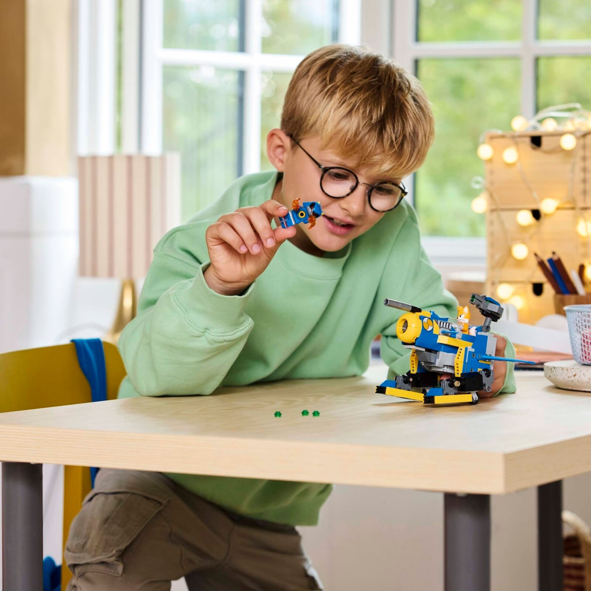 Brinquedos de personagens Sonic – um brinquedo mech do Tails também inclui um cockpit para minifiguras, espaço para armazenamento de ferramentas mech e uma torre articulada com atirador de pinos para ajudar na defesa contra o Metal Sonic enquanto eles lutam