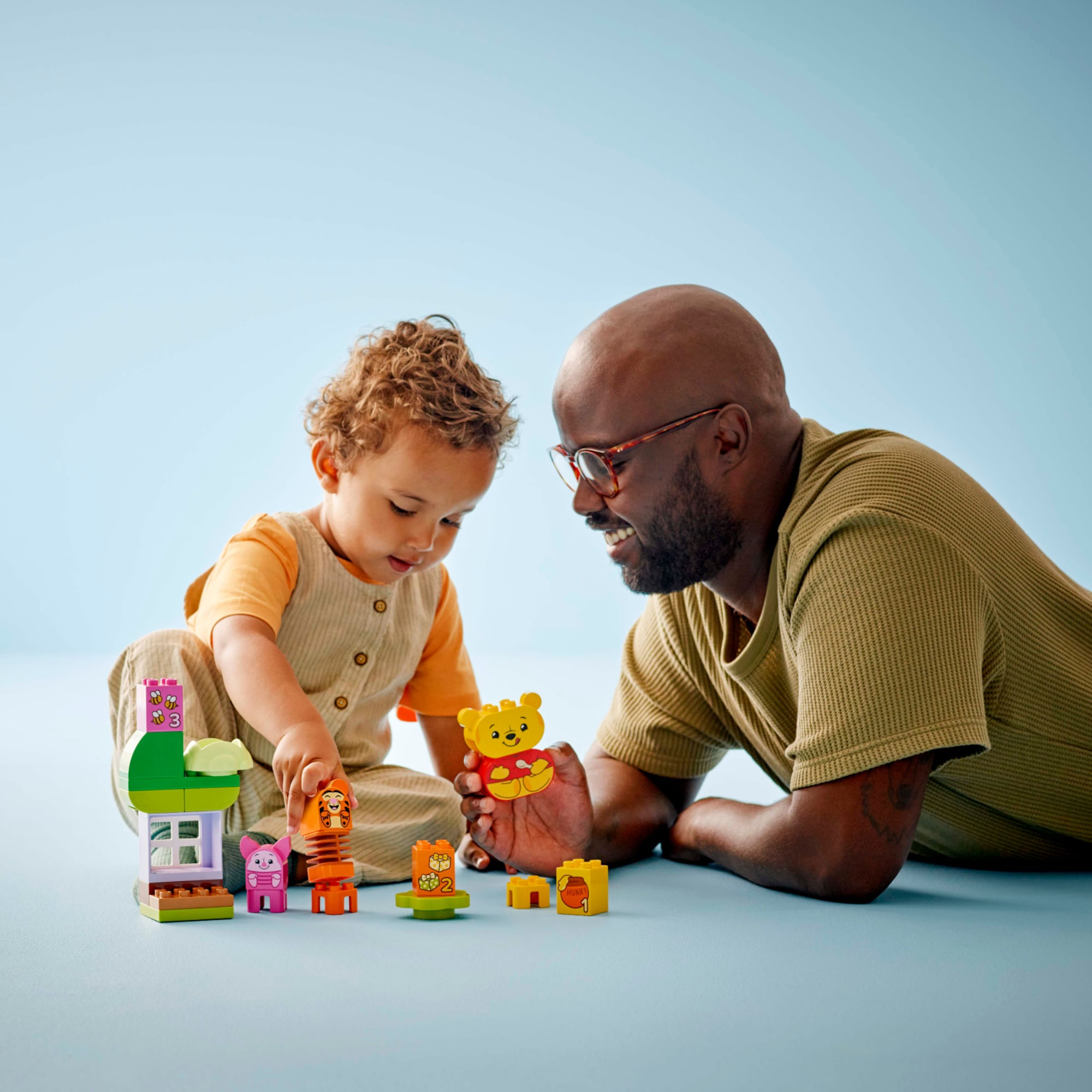 Pais e crianças pequenas aproveitam momentos de brincadeiras criativas e aprendem brincando com o conjunto de construção LEGO® DUPLO® | Disney Winnie the Pooh's Birthday Party (10457). Este brinquedo de construção educacional colorido ajuda crianças de 18 meses ou mais a praticar habilidades iniciais enquanto aproveitam a brincadeira imaginativa.
