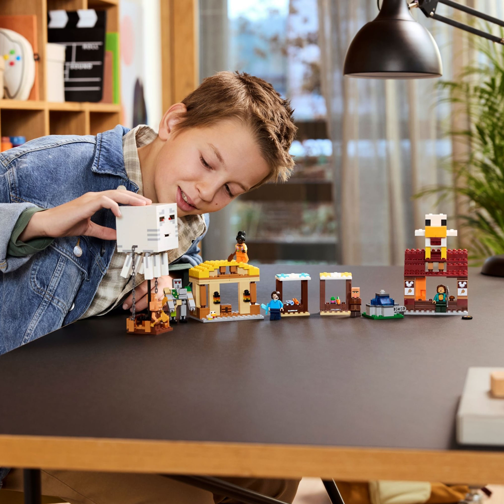 O conjunto apresenta personagens populares do videogame: Steve, Natalie, Dawn, 2 piglins, um balão fantasma, aldeão, pintinho e uma figura de golem de ferro ajustável. O balão tem espaço para os piglins e incorpora um disparador de disco. Entre a vila estão barracas de mercado, o restaurante de frango frito de Steve, sua cabana de artesanato e uma fonte, que as crianças podem "explodir" usando um recurso integrado. O telhado do restaurante é coberto com um grande modelo de galinha que inclui uma divertida função de postura de ovos. Para diversão digital, o aplicativo LEGO Builder permite que as crianças ampliem, girem modelos em 3D e acompanhem seu progresso.
