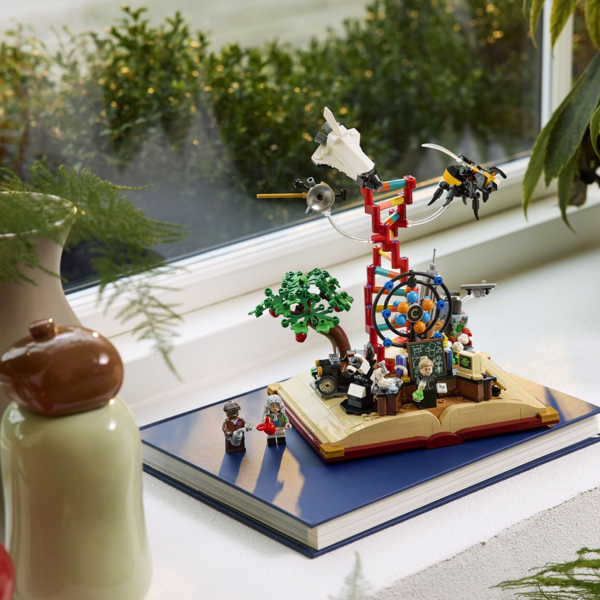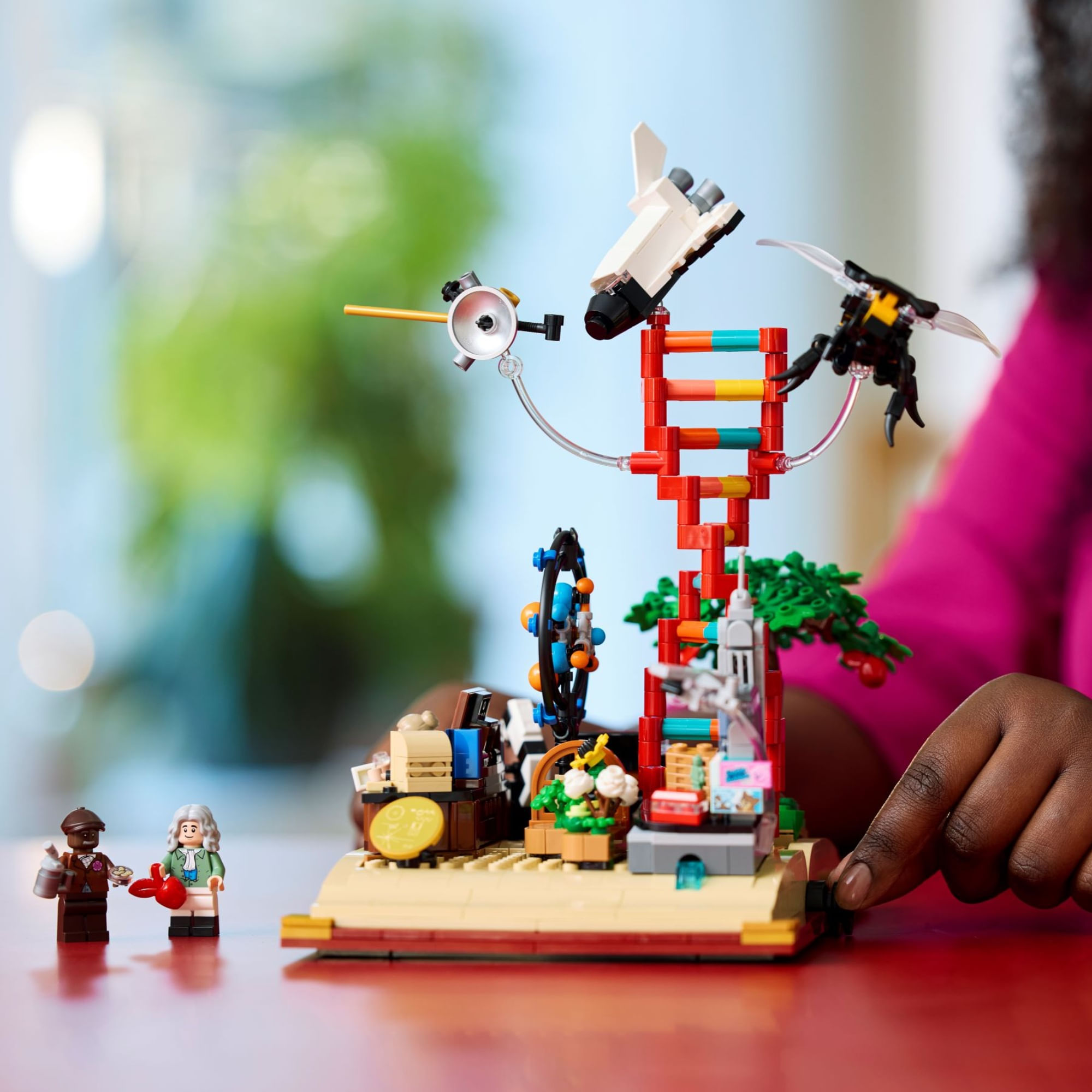 Modelo de exposição colecionável para adultos – Uma base montável em forma de livro aberto é coberta com muitas mini construções, incluindo a macieira de Newton, o canteiro de plantas de Carver, um ônibus espacial e um braço robótico