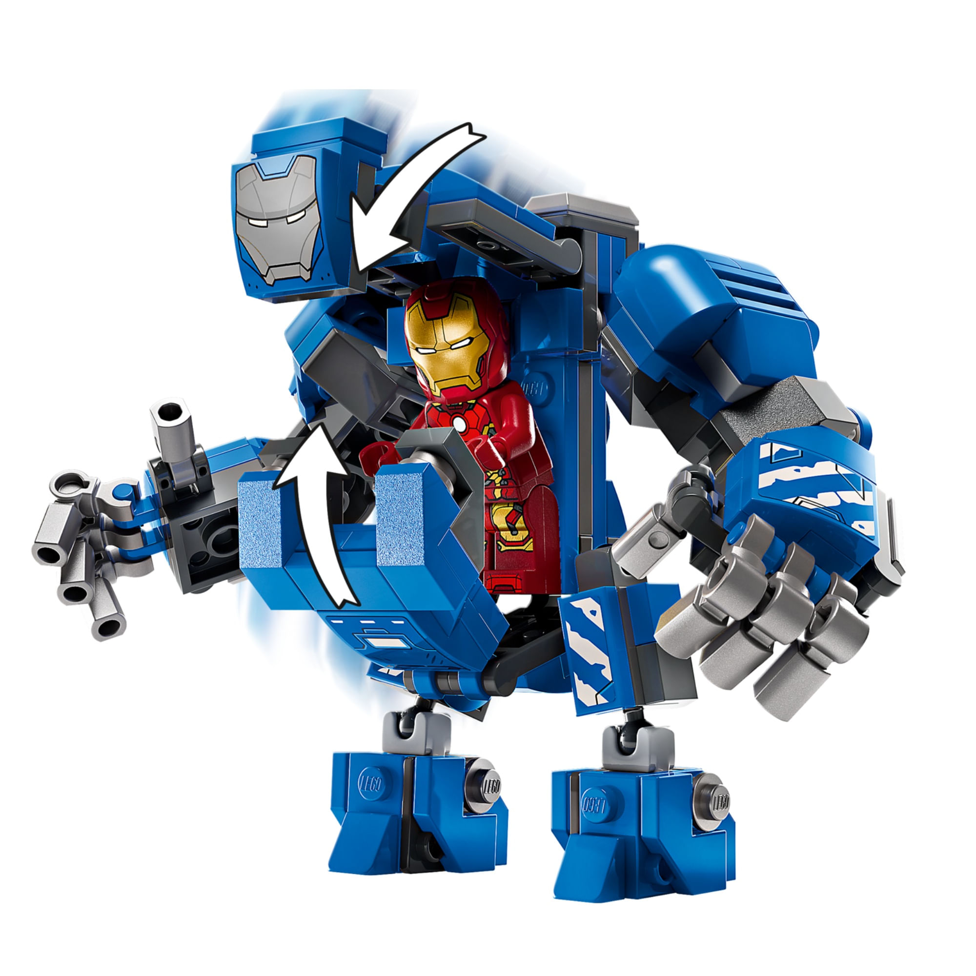 Personagens de super-heróis – armaduras do Homem de Ferro MK1, MK43 e MK6, minifiguras de Pepper Potts e AldrichKillian, um robô Dum-E montável e um mech MK3 com braços e pernas móveis e um cockpit que abre