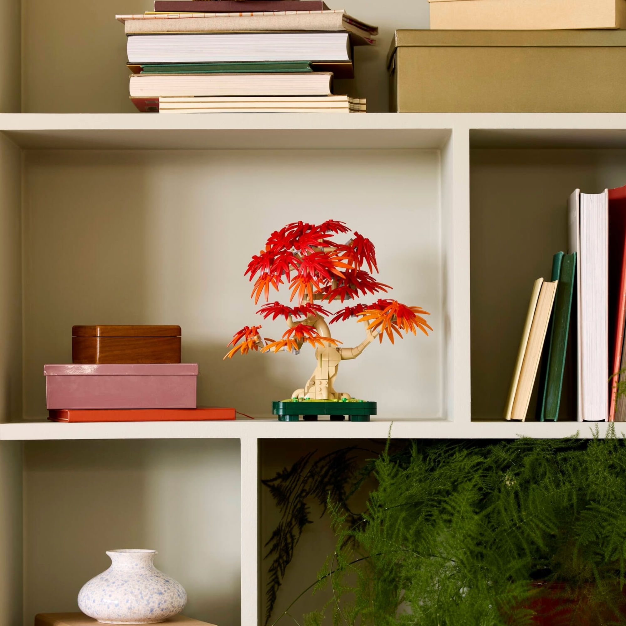 Cores de outono – Capturando a vibração da natureza, a árvore LEGO® apresenta folhas vermelhas e âmbar e fica em um vaso verde escuro para fácil exibição