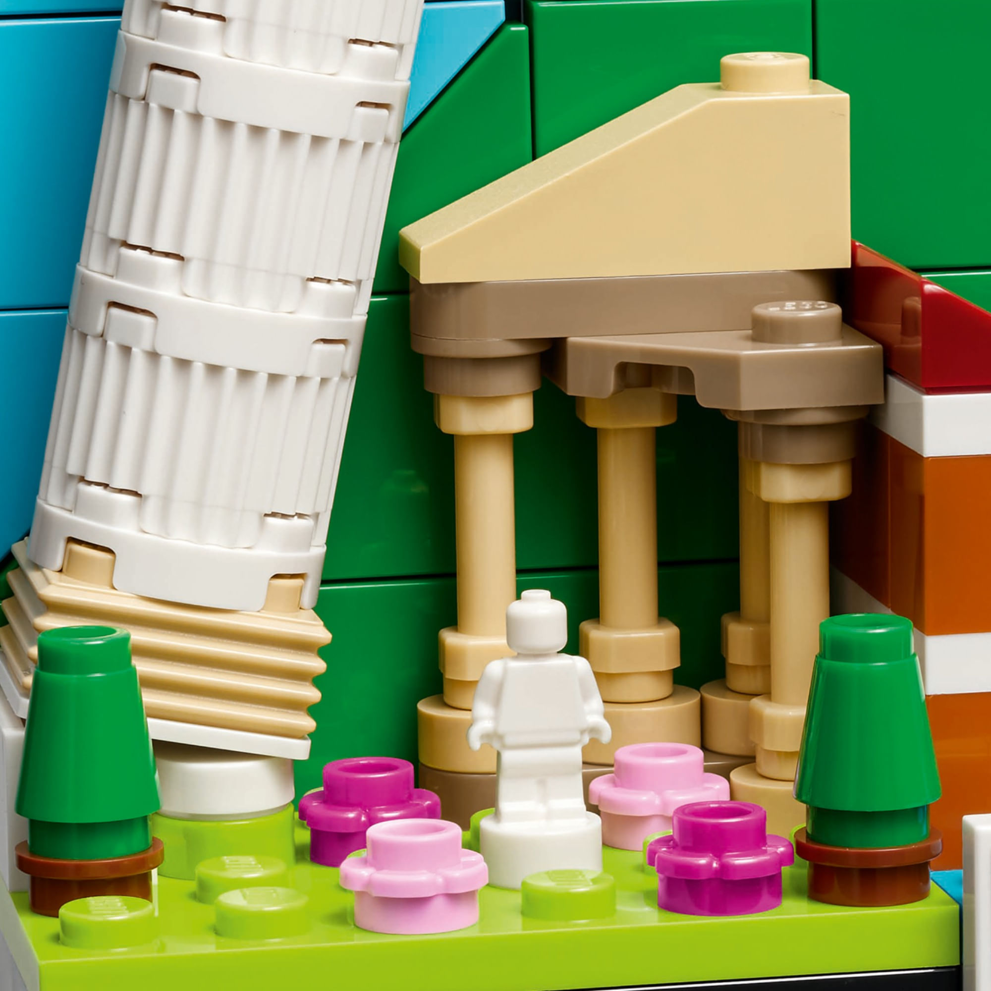 Aproveite as vistas – O cartão postal LEGO® Itália apresenta a Torre de Pisa inclinada, ruínas romanas, a Ponte Rialto em Veneza e a bela cidade de Positano na Costa Amalfitana