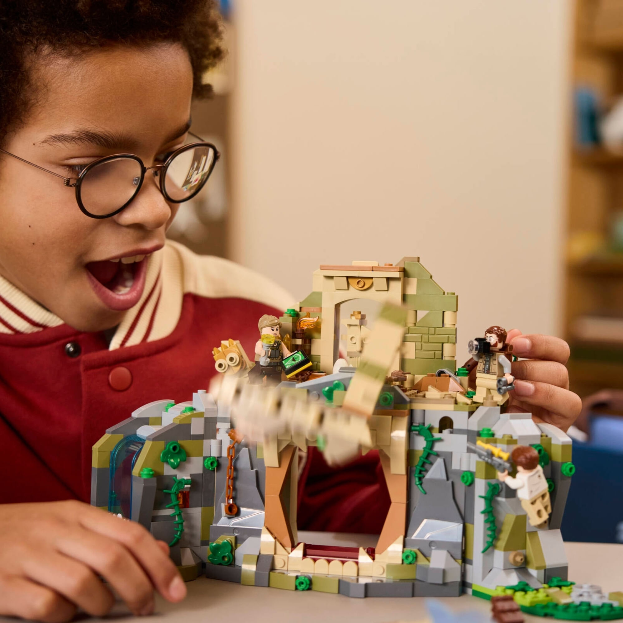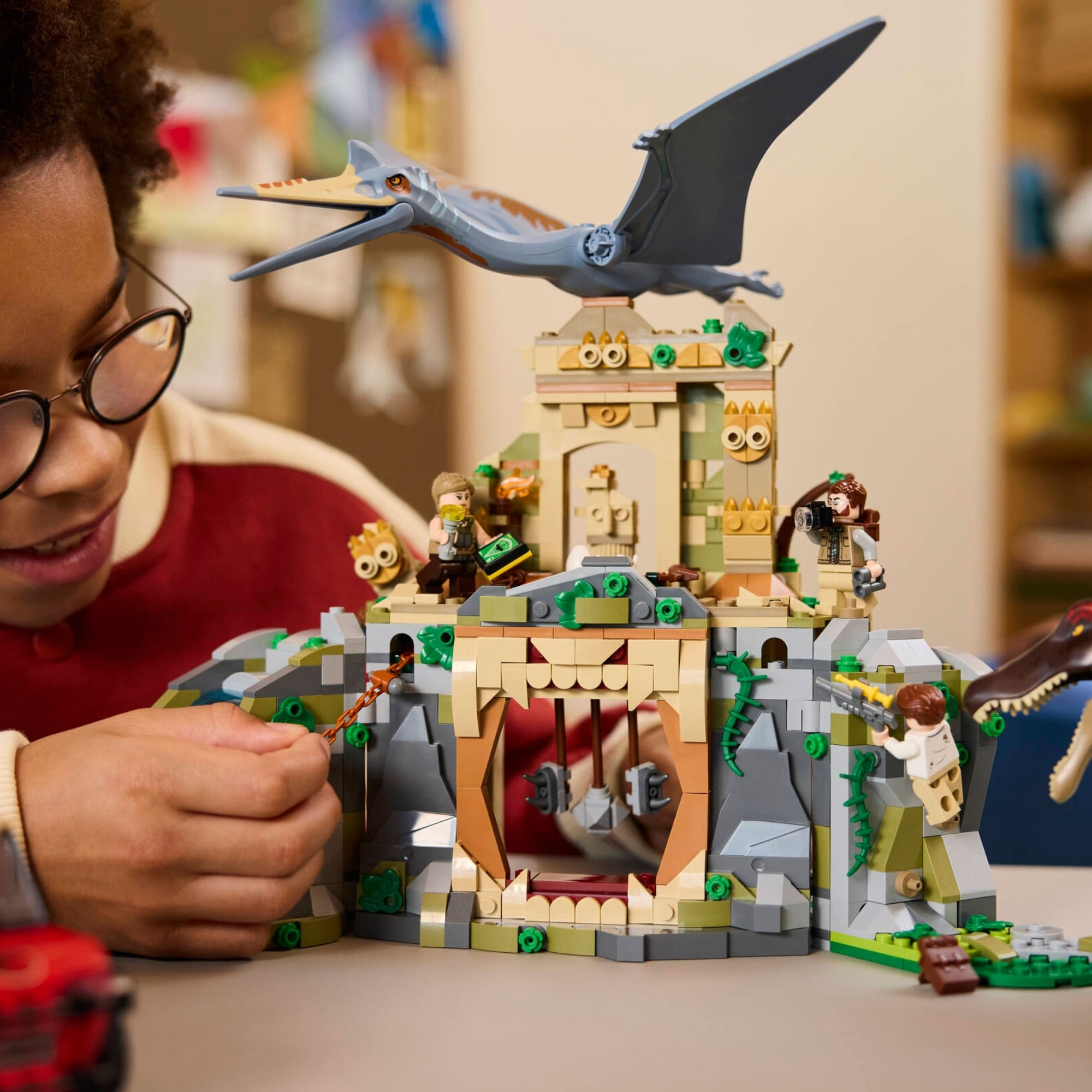Cenário interativo – Este kit de construção de dinossauro LEGO® Jurassic World inclui um templo com um ninho, uma parede de escalada de brinquedo, cachoeira e 2 entradas, um helicóptero de brinquedo e um caminhão de brinquedo