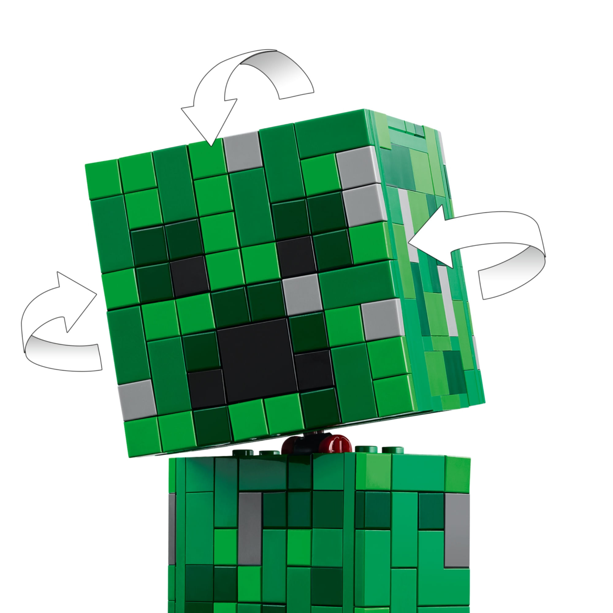 Uma surpresa escondida – A parte frontal da cabeça da figura LEGO® Minecraft® Creeper™ se destaca para revelar um espaço interno contendo uma minifigura Creeper da primeira versão e um elemento TNT