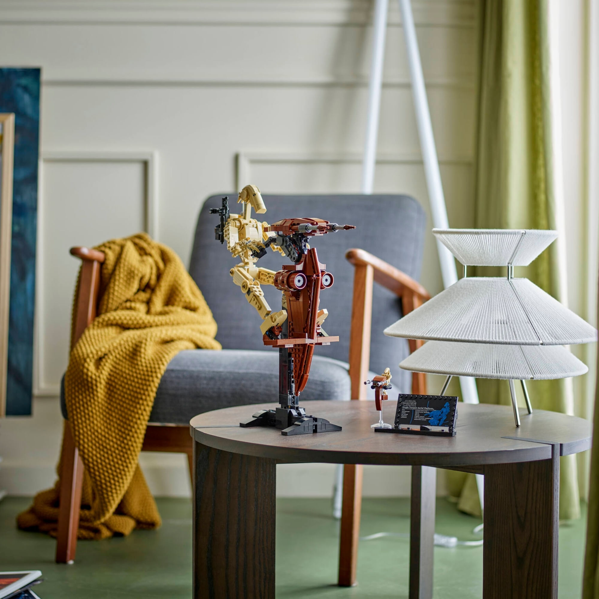 Decoração de mesa divertida – O suporte de exposição possui uma placa de informações embutida e espaço para a figura LEGO® Battle Droid incluída com seu speeder STAP