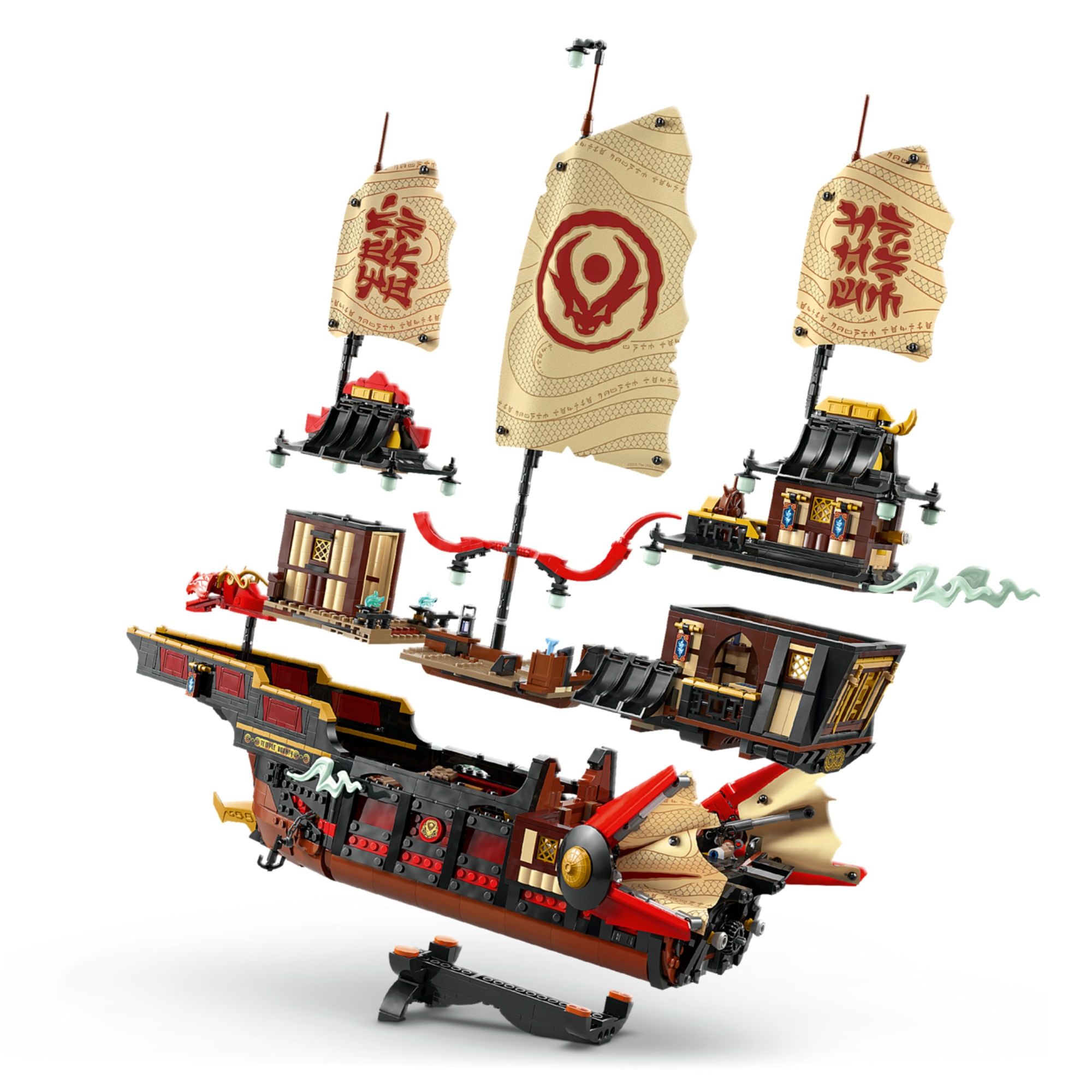 Medidas – Quando exibido em seu suporte, o modelo de barco LEGO® NINJAGO® The Temple Bounty de 2.387 peças mede mais de 49 cm de altura, 58 cm de comprimento e 26 cm de largura.