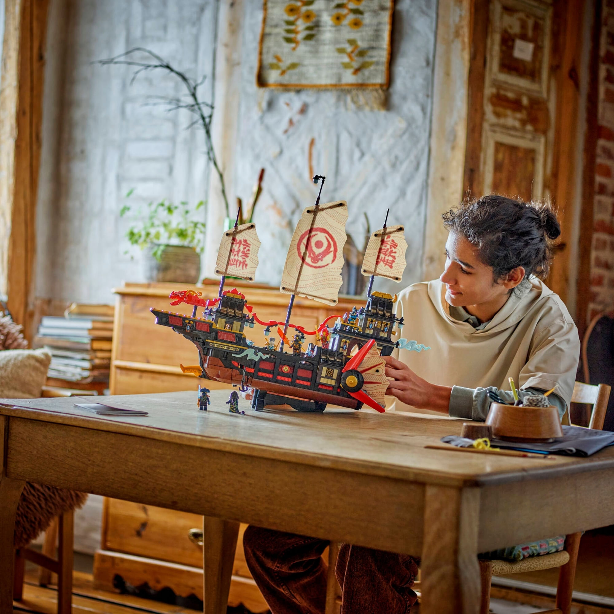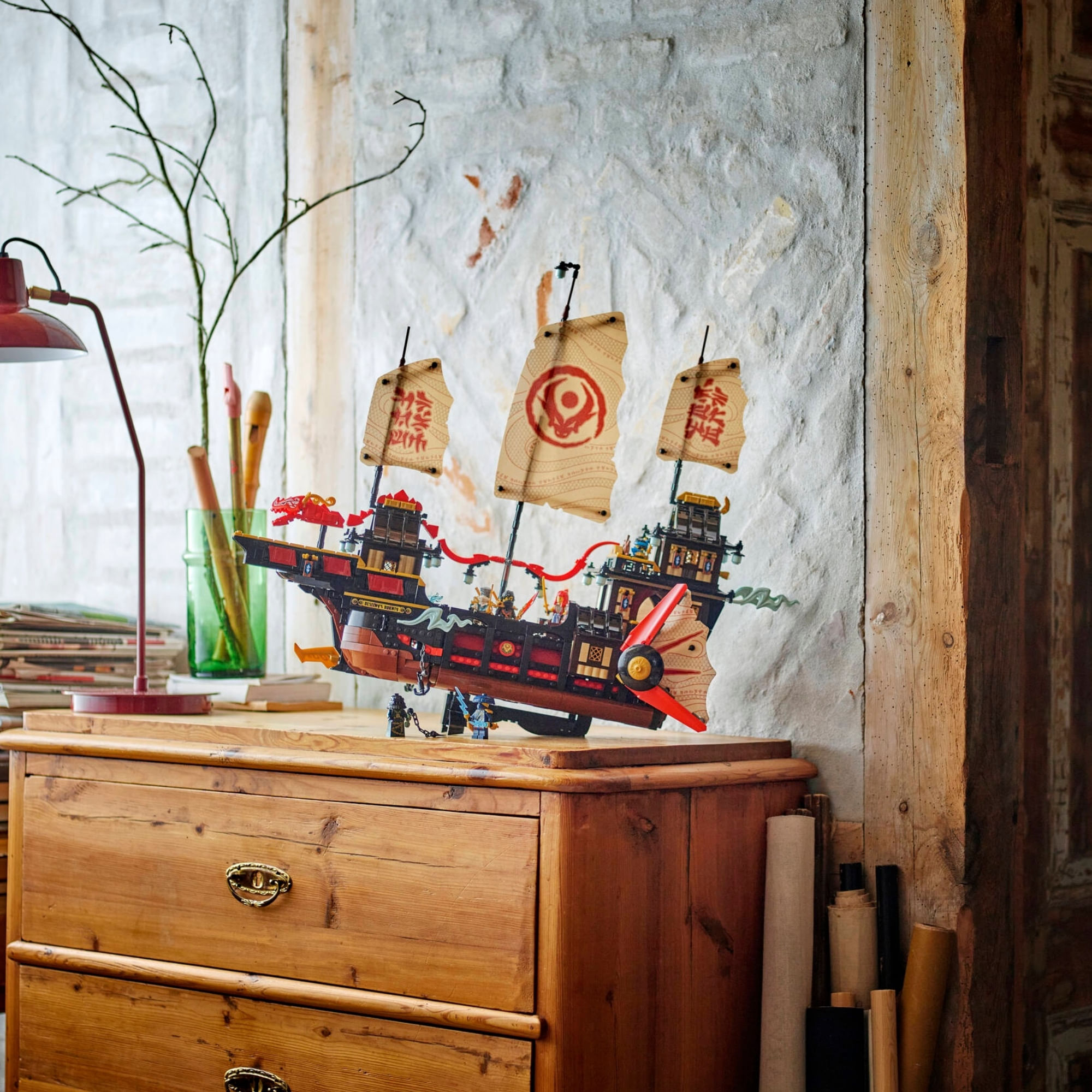 Conjunto de jogo de navio interativo – os fãs do NINJAGO® giram uma engrenagem para mover as velas, removem tetos e pisos para obter acesso ao interior e a um bar de sushi e dobram uma mesa na cabine principal para revelar um segredo