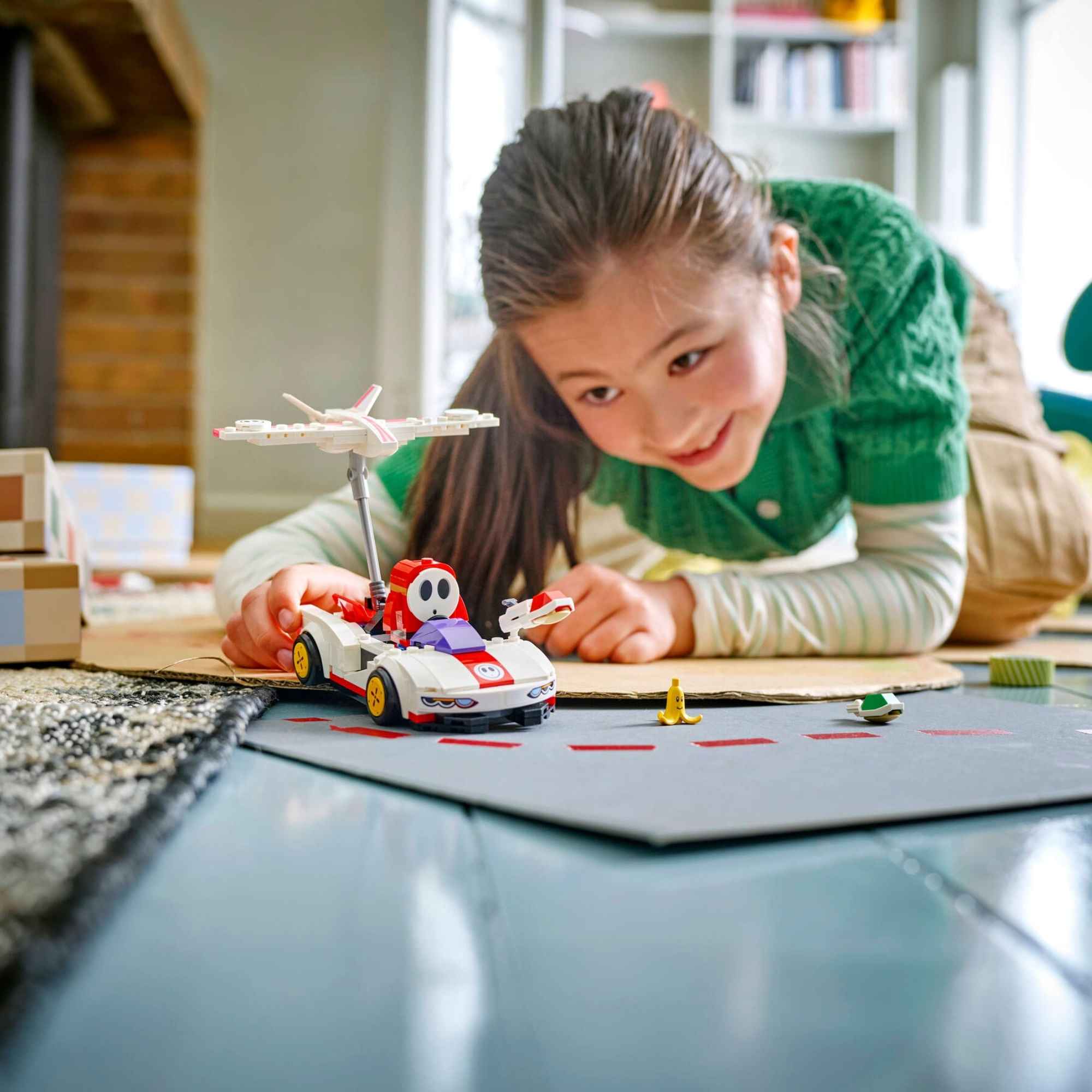 Jogo interativo – Dirija o P-Wing com LEGO® Mario™, LEGO® Luigi™ ou LEGO® Peach™ (figuras não incluídas) para ativar os efeitos sonoros e visuais do Mario Kart™ para iniciar a corrida, derrapar, planar e muito mais.