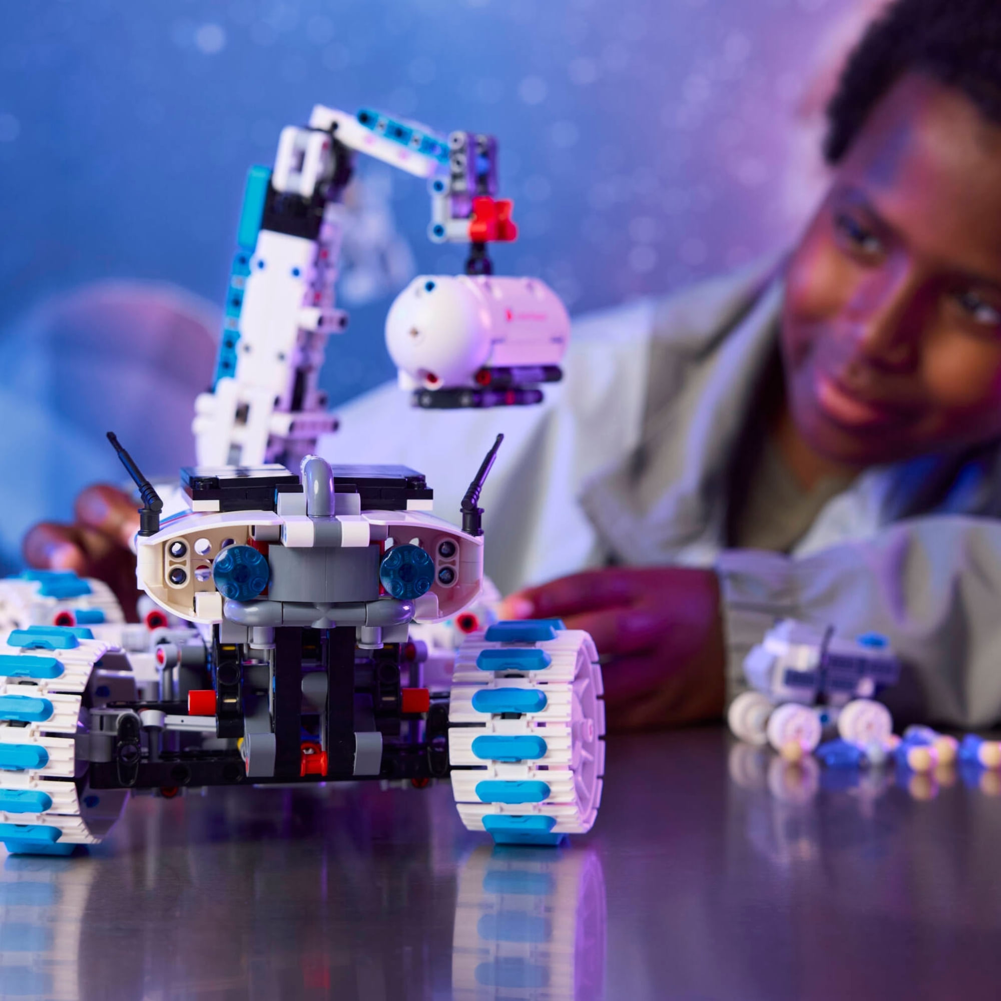 Este conjunto possui diversos recursos para despertar a criatividade narrativa. O modelo principal é um rover lunar futurista todo-terreno com suspensão basculante, direção nas quatro rodas, painéis solares implantáveis ??e um braço giratório. Use o braço para levantar o rover de mineração menor e enviá-lo em uma missão para recuperar os elementos do regolito lunar (rocha lunar). Armazene as rochas no recipiente de amostras e, em seguida, implante o rover MAPP para coletar mais informações sobre a superfície lunar.