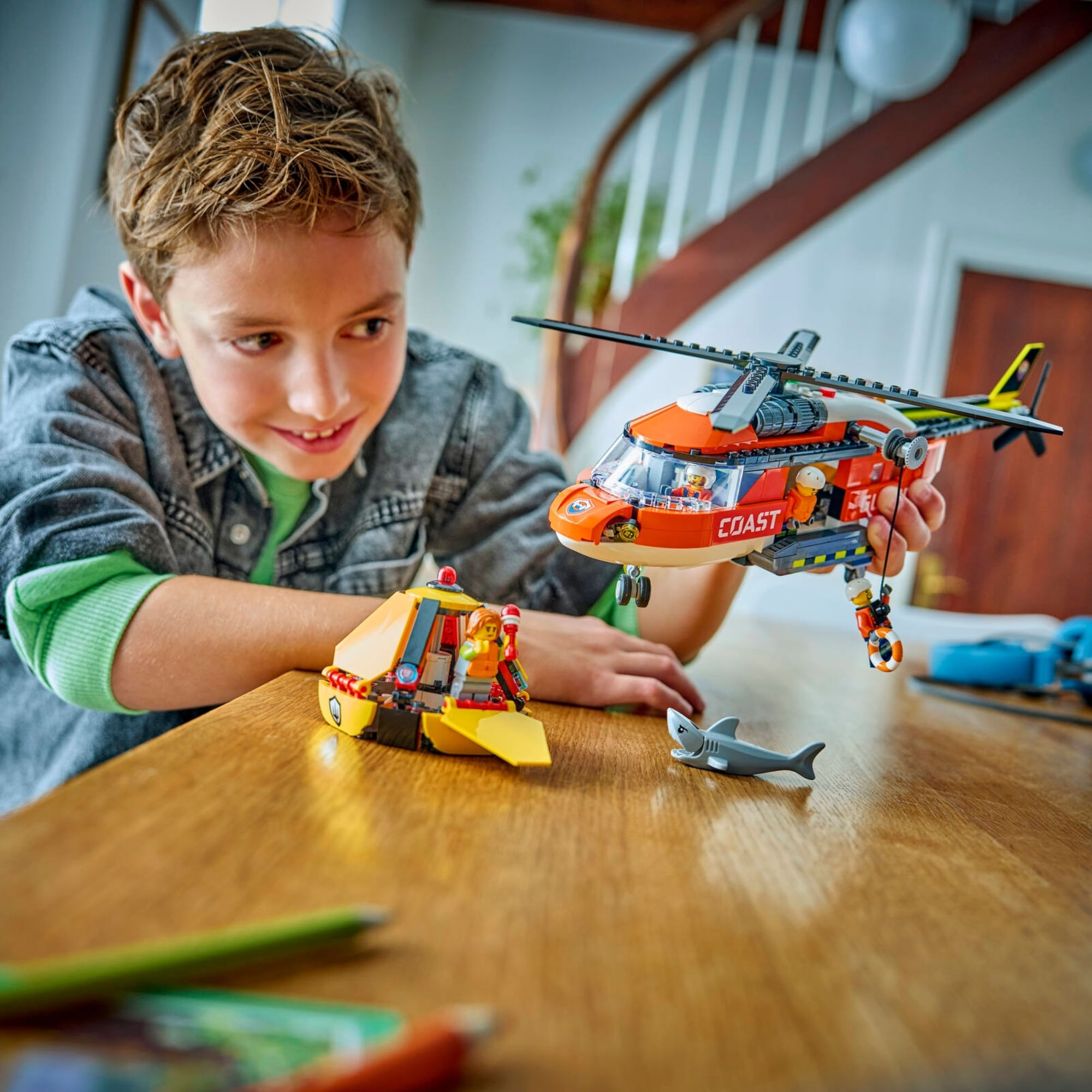 Este conjunto de construção LEGO® City Helicóptero da Guarda Costeira (60503) está repleto de detalhes autênticos para fãs de brincadeiras de faz-de-conta e brinquedos de veículos de emergência. O impressionante modelo de helicóptero vermelho apresenta rotores giratórios, portas laterais deslizantes, uma rampa traseira dobrável e uma cabine e fuselagem detalhadas. As crianças podem baixar um membro da tripulação com o guincho do helicóptero e o conjunto também inclui uma cápsula de resgate que se abre para acesso ao seu interior. Basta adicionar o piloto, um civil, 2 guardas costeiros e um tubarão para horas de brincadeiras imaginativas. Este conjunto de construção detalhado é um presente divertido para meninos e meninas de 7 anos e crianças que adoram brincadeiras LEGO cheias de ação. Combine-o com outros conjuntos LEGO City (vendidos separadamente) para aventuras ainda maiores. As crianças podem aumentar a diversão da construção com este conjunto LEGO Helicóptero da Guarda Costeira no aplicativo LEGO Builder, onde podem ampliar e girar com instruções em 3D, salvando e acompanhando o progresso enquanto constroem. O conjunto contém 551 peças. CONJUNTO DE BRINQUEDO HELICÓPTERO DE RESGATE – Aventuras emocionantes de busca e resgate aguardam você com o kit de construção LEGO® City Helicóptero da Guarda Costeira (60503) para crianças a partir de 7 anos. O QUE VEM NA CAIXA – Inclui tudo o que as crianças precisam para construir um helicóptero de resgate marítimo detalhado, cápsula de resgate, além de minifiguras de piloto, civil e 2 guarda-costas, e uma figura de tubarão. FUNÇÕES REALISTAS PARA BRINCADEIRAS IMAGINATIVAS – O helicóptero de brinquedo possui portas deslizantes, rotores giratórios e um guincho funcional, além de uma cápsula de resgate que se abre para dar acesso ao seu interior detalhado. ACESSÓRIOS PARA MINIFIGURAS LEGO® – Inclui kit médico de brinquedo, binóculos, walkie-talkie e colete salva-vidas para brincadeiras imaginativas. PRESENTES DIVERTIDOS PARA CRIANÇAS – Este helicóptero de brinquedo da guarda costeira é um ótimo presente para meninos e meninas de 7 anos que adoram brinquedos que estimulam a imaginação e proporcionam brincadeiras interativas. UMA FORMA DIVERTIDA DE CONSTRUIR – O aplicativo LEGO® Builder guia as crianças em uma aventura de construção intuitiva, onde elas podem salvar conjuntos, acompanhar o progresso e ampliar e girar os modelos usando instruções em 3D enquanto constroem. EXPANDA O MUNDO LEGO® CITY – As crianças podem adicionar este brinquedo de busca e resgate a outros conjuntos de construção (vendidos separadamente) da linha LEGO City para aventuras ainda maiores. DIMENSÕES – O helicóptero vermelho de brinquedo neste conjunto de faz-de-conta com 551 peças mede mais de 11 cm de altura, 38 cm de comprimento e 26 cm de largura.