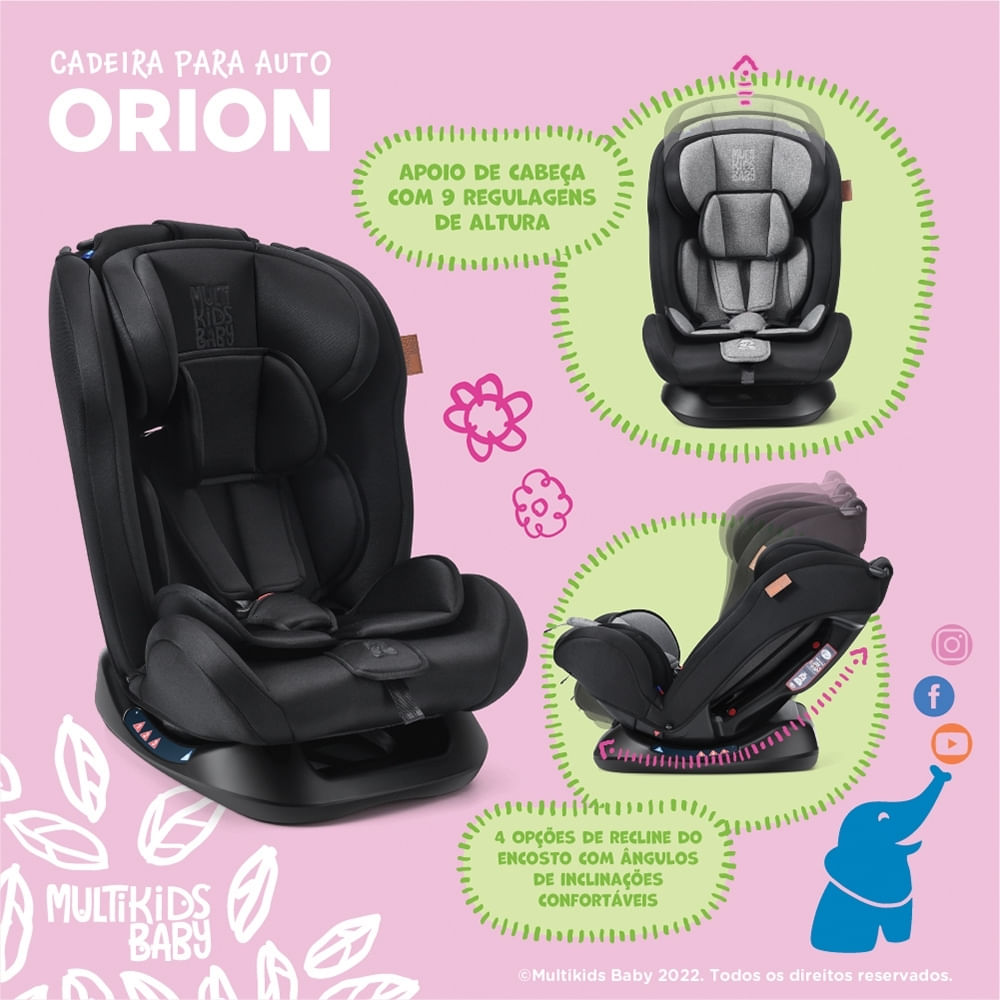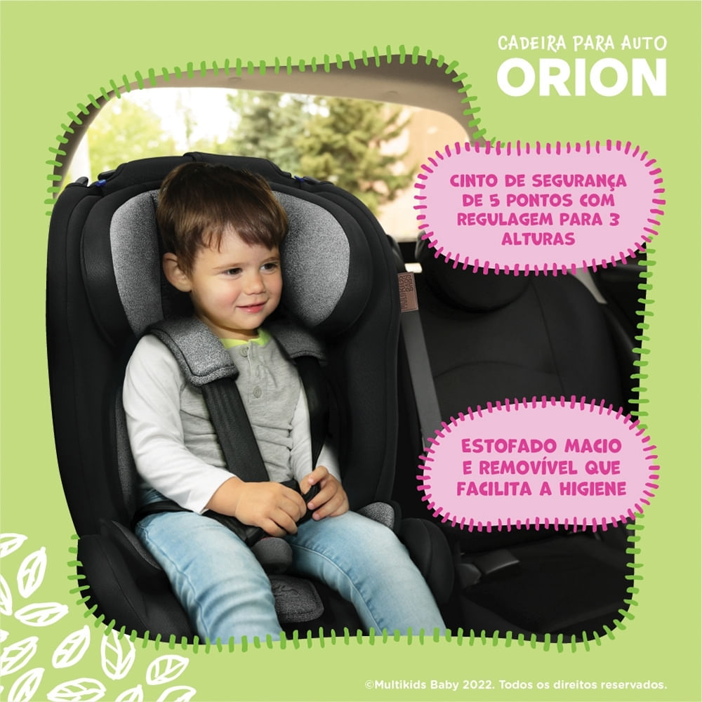 A cadeira para auto Orion Multikids Baby usa o cinto de 3 pontos do veículo como sistema de retenção e por isso é compatível com praticamente todos os veículos do mercado. São 4 opções de recline de encosto em ângulos que deixam a cadeira confortável para o seu bebê. O apoio de cabeça pode ser ajustado em 9 alturas diferentes, para ir assim acompanhando o crescimento do seu pequeno. O tecido é suave e removível para facilitar a higienização. O estofamento é macio e vem com almofada redutora de corpo e cabeça para acomodar melhor os bebês menores. A Orion é ideal para quem procura uma única cadeira para toda a infância sem abrir mão do conforto e é claro, da segurança.